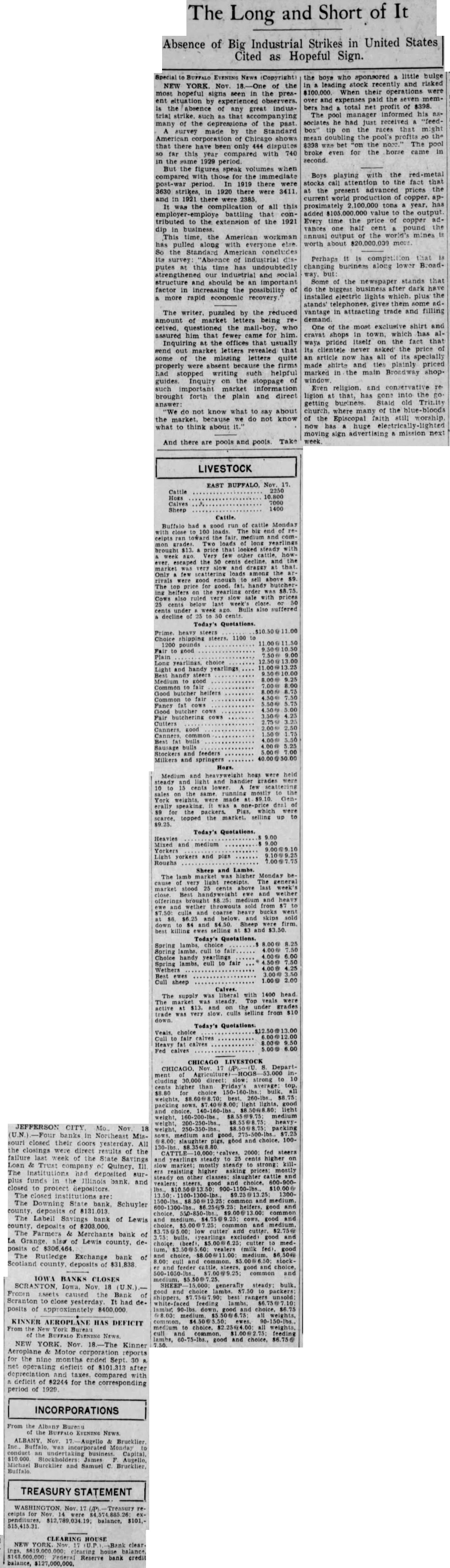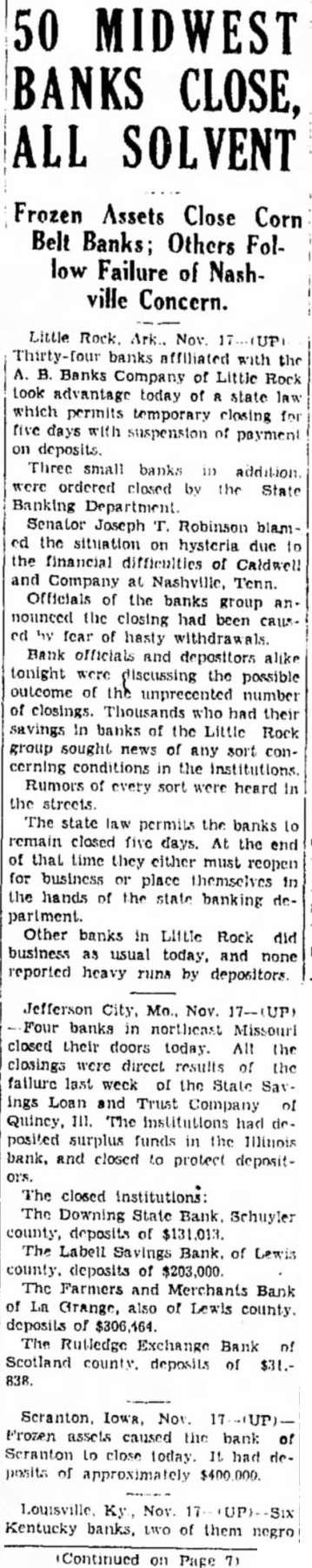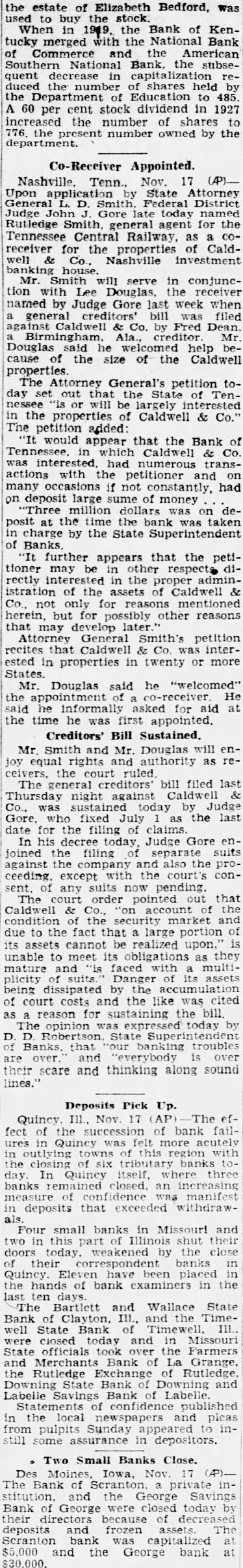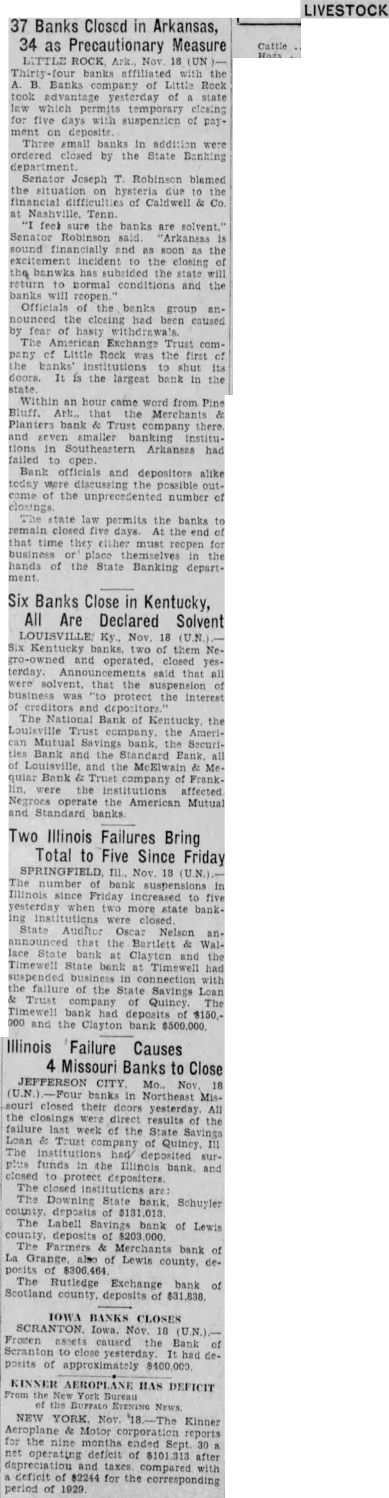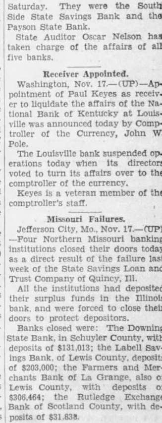The recently reopened Bartonville State bank at Bartonville was held up by a robber, who took $10,000 in cash and escaped. Albert Miller, sixty-three, for 20 years an employee of the Goebel hotel at Granite City. committed suicide by hanging himself, The A. P. Eaton elevator at Allerton was sold by the federal referee in bankruptcy to H. S. Johnston of Danville for $7,750. Prof. Alfred O. Willgeroth was appointed director of music at Rockford college, succeeding Mrs. Laura Grant Short, who died recently. Cecil Sweasey, twenty-eight, of Blandinsville was burned to death when his automobile overturned on the hard read near Roseville. Joseph Pence, for many years highway commissioner of Pana township and brother of Jess Pence of Taylorville, died at his home in Pana. Thomas Watson, fifty-five, employed at Orient mine No. 2, died from burns received when a shot he was tamping in the face of the coal exploded. Abel Hanson, seventy-five was found dead of a shot gun wound on a brush pile near his home north of Morris. Police believed the death was accidental. Close to $25,000,000 Christmas savings will be distributed among 450,000 residents of Cook county. The figures were checked after 277 banks submitted reports. Three hundred members of the American Legion spent a day sawing down trees and chopping wood to be given during the winter to families of jobless men. Identified by an oil station attendant as the man who robbed him of $128, Fred D. Glidden of Kewanee has been bound over to the Champaign county grand jury. John F. Zeman, twenty-nine, of Peoria, was drowned when a boat from which he and two companions were hunting was overturned by rough water on the Illinois river. Displaying a Minkler apple that measured six inches in diameter and weighed eighteen ounces, Ralph Bryce, orchardist near Irving, claimed the record for raising the largest apple in Illinois this season. Two of the oldest banking institutions in Henry county were merged with the announcement of the consolidation of the First National Bank of Cambridge and the Farmers' National Bank of Cambridge. Mrs. Mary Lawson, Chicago, was elected regent of the Illinois Daughters of Isabella at the semiannual state convention in Bloomington. Kankakee was chosen for the next state meeting, to be held in May. Earl Hanson, principal of the Rock Island high school, was elected president of the Kiwanis club. Other officers named are: Vice president, Kenneth Popplewell: trustee, B. L. Burker: treasurer, Robert Gilloley. Rock Island detectives shot and killed Zoaney Merreighn, age thirtysix, father of four children. when they sought to arrest him on an arson charge. The detectives said Merreighn moved as though to draw a revolver. Kidnaped, his car and money stolen, and bound so securely that he lay helpless in a field for eight hours, Alof Anderson of Jamestown, N. D., an aviator, was found near Topeka by Walter Kleier, farmer, upon whose land he was left. The soup house plan has been abandoned in Danville after a vigorous protest by the chamber of commerce. It has another plan and will seek jobs for the unemployed. No plans for feeding the hungry while awaiting Jobs have been announced. Jobs for 10,000 men are to be provided by the first of the year through the construction of 13 new school buildings at a total cost of more than $20,000,000, according to the announcement of William J. Bogan, superintendent of Chicago schools. Stuart Walser, forty-five, cashier of the First National bank and receiver for the West Salem State bank, which has been closed about two years, shot and killed himself in his bank at West Salem. Members of his family said Walser suffered from asthma for years. Keeping company with a pupil is no grounds for dismissal of a teacher, a jury in Mercer county court ruled in awarding Miss Ella Deweiler $400 back salary in her suit against the New Boston board of education. The board "fired" the twenty-two-year-old teacher last December because she went around with Charles Bayner, a high school senior. Her first suit was dismissed, but on the retrial she was awarded the amount of her back salary. George Mayford, a member of the Alton city police department for more than twenty-five years, was appointed chief of police to succeed Peter Fitzgerald, elected sheriff November 4. Mayford has been a sergeant in recent years. Six small banks in Illinois and Missouri communities near Quincy have closed. These were the Farmers and Merchants of La Grange, Mo.; the Rutledge Exchange of Rutledge, Mo.; the Downing State of Downing, Mo.; the Bartlett and Wallace State of Clayton, III. and the Timewell State of Timewell, III.