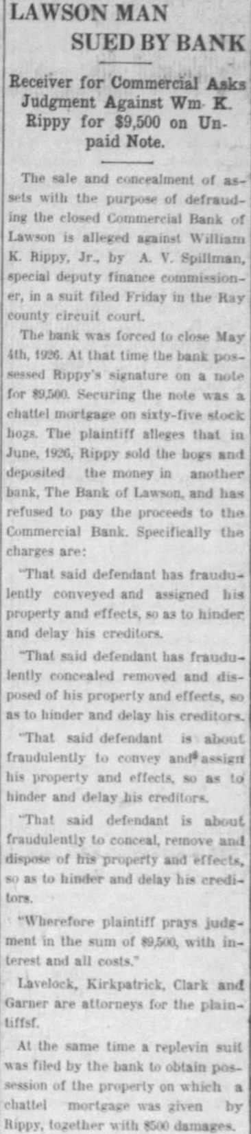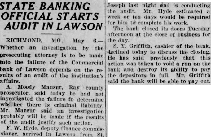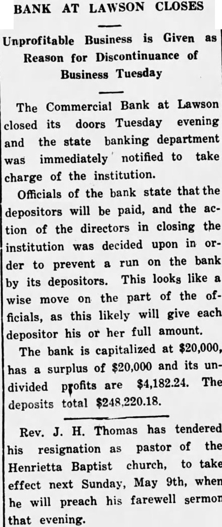 BANK AT LAWSON CLOSES Unprofitable Business is Given as Reason for Discontinuance of Business Tuesday The Commercial Bank at Lawson closed its doors Tuesday evening and the state banking department was immediately notified to take charge of the institution. Officials of the bank state that the depositors will be paid, and the action of the directors in closing the institution was decided upon in order to prevent a run on the bank by its depositors. This looks like a wise move on the part of the officials, as this likely will give each depositor his or her full amount. The bank is capitalized at $20,000, has a surplus of $20,000 and its undivided profits are $4,182.24. The deposits total $248,220.18. Rev. J. H. Thomas has tendered his resignation as pastor of the Henrietta Baptist church, to take effect next Sunday, May 9th, when he will preach his farewell sermon that evening.