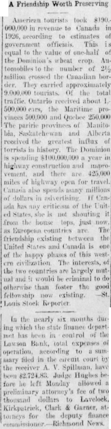 Friendship Worth Preserving American tourists took $190.000,000 in revenue to Canada in 1926, according to estimates of government officials. This is equal to the value of one-half of the Dominion's wheat crop. Automobiles to the number of 2½ million crossed the Canadian border. They earried approximately 9.000,000 tourists. Of the total traffic. Ontario received about 500,000 cars, the Maritime provinees 500,000 and Quebec 250,000 The paririe provinces of Manitobia, Saskatchewan and Alberta received the greatest influx of torrists in history. The Dominion is spending $100,000,000 a year in highway construction and improvement. and there are 425,000 miles of highway open for travel. Canada also spends many millions of dollars in advertising If Canada has any criticism of the Unit ed States, she is not shouting it from the house tops, just now. as European countries are The friendship existing between the United States and Canada is one of the happy phases of this westcrn civilization The interests, of the two countries are largely mutual and it would be eriminal to do otherwise than foster the good fellowship now existing. -St. Louis Stock Reporter. In the nearly six months due ing which the state finance depart met has been in control of the Lawson Bank, total expenses of operation, according to a summary filed in the circuit court by the receiver A. V. Spillman, have been $2,724,83. Judge Hughes before he left Monday allowed a preliminary attorney's fee of two thousand dollars to Lavelock, Kirkpatrick, Clark & Garner, attorneys for the deputy finance News.