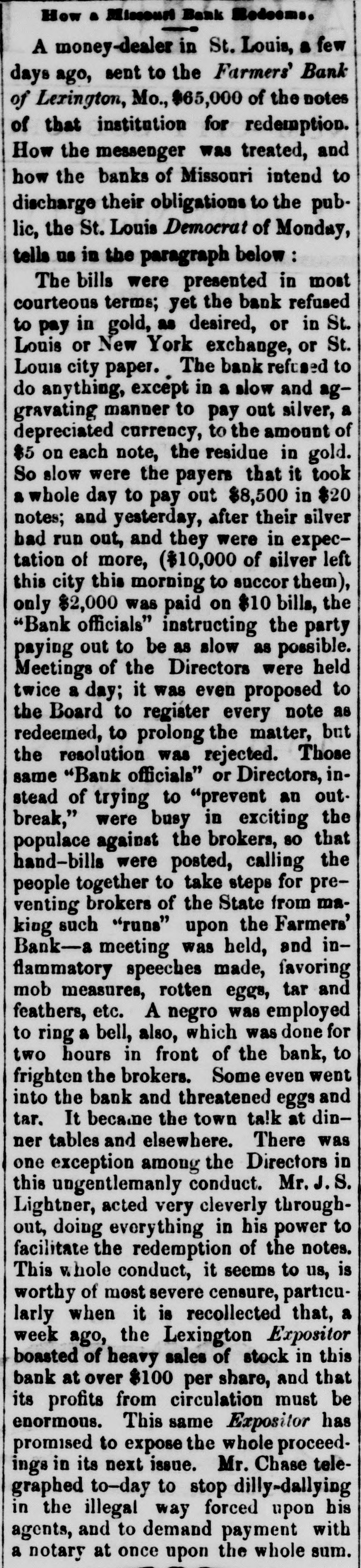 How a Missouri Bank Medeems. A money-dealer in St. Louis, a few days ago, sent to the Farmers' Bank of Lexington, Mo., $65,000 of the notes of that institution for redemption. How the messenger was treated, and how the banks of Missouri intend to discharge their obligations to the public, the St. Louis Democrat of Monday, tells us in the paragraph below : The bills were presented in most courteous terms; yet the bank refused to pay in gold, as desired, or in St. Louis or New York exchange, or St. Louis city paper. The bank refused to do anything, except in a slow and aggravating manner to pay out silver, a depreciated currency, to the amount of $5 on each note, the residue in gold. So slow were the payers that it took a whole day to pay out $8,500 in $20 notes; and yesterday, after their silver bad run out, and they were in expectation of more, ($10,000 of silver left this city this morning to succor them), only $2,000 was paid on $10 bills, the "Bank officials" instructing the party paying out to be as slow as possible. Meetings of the Directors were held twice a day; it was even proposed to the Board to register every note as redeemed, to prolong the matter, but the resolution was rejected. Those same "Bank officials" or Directors, instead of trying to "prevent an out. break," were busy in exciting the populace against the brokers, so that hand-bills were posted, calling the people together to take steps for preventing brokers of the State from making such "runs" upon the Farmers' Bank-a meeting was held, and inflammatory speeches made, favoring mob measures, rotten eggs, tar and feathers, etc. A negro was employed to ring a bell, also, which was done for two hours in front of the bank, to frighten the brokers. Some even went into the bank and threatened eggs and tar. It became the town ta!k at dinner tables and elsewhere. There was one exception among the Directors in this ungentlemanly conduct. Mr. J.S. Lightner, acted very cleverly throughout, doing everything in his power to facilitate the redemption of the notes. This whole conduct, it seems to us, is worthy of most severe censure, particularly when it is recollected that, a week ago, the Lexington Expositor boasted of heavy sales of stock in this bank at over $100 per share, and that its profits from circulation must be enormous. This same Expositor has promised to expose the whole proceedings in its next issue. Mr. Chase telegraphed to-day to stop dilly-dallying in the illegal way forced upon his agents, and to demand payment with a notary at once upon the whole sum.
