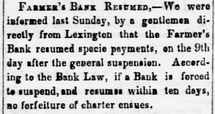 MONETARY AND COMMERCIAL. Financial Affairs. In Monetary matters a further improvement is looked for this week, and increased animation in general business. If the Pork market be as active as anticipated, the Bills thrown on the market will cause a decline in Eastern Exchange-perhaps to ½ prem. Gold will, of course, rule as Exchange. It is in little request now, and is accumulating in the Banker's vaults. The Monetary market continues close, of course, and nothing can be predicted of the future; so many and various are the financial influences at work in other parts of the country. Cincinnati is safe and strong, and if matters were settled in the South, we should now be enjoying a very brisk trade. Uncurrent Money will probably improve this week, though not so much as it did last week. The rate is now about 5 discount for all Notes that are deemed solvent and safe, while the Western Banks rule higher. Unless there are new disturbing causes, Hogs will, we think, advance somewhat this week, and holders will obtain $5 20, in a day or two, without difficulty. At that price the market closed on Saturday, but buyers would not pay the figure. Our New York mailfailed yesterday morning, and we are without Friday evening's advices from that city. Saturday's St. Louis Reputlican remarks: There is a more cheerful feeling in business circles since the recent action of our Banks. Discounts are somewhat easier. In the Exchange market the supply was reported as rather better. The rates of drawing with the Savings Institutions continued at five per cent., -but the Bank rates are lower, customers being supplied, though sparingly. Currency is in supply, but the rate of discount, from two to three per cent., is unchanged. The Western Bank of Missouri, at St. Joseph, suspended Friday, on hearing of the suspensions at St. Louis. It is said that the Farmers' Bank, at Lexington, has suspended also. Some of the institutions are considering the question of liability under the law of dealing in the notes of suspended Banks. Saturday's St. Louis papers say of Hogs on Friday: Hogs were considered somewhat firmer, with but few offering. 1,500 to 2,000 head have been sold within three days, at 5½, 53/4 and 6c., the last for hogs of 200 lbs. weight, and for still heavier weights $6 12½ per 100 pounds. About 11,000 head have been slaughtered in St. Louis up to this date. Our Saturday's Chicago exchangesobserve: There is no alteration worth reporting in Eastern Exchange. Rates are stiff at 7 per cent. from the Banks, but very little is being made by shipments of produce to the East, nor is there likely to be much made so long as prices of grain, flour and provisions remain so low at the seaboard. Yet many think that the worst is past, and that in a short time the market will react, and both Financial and Commercial matters improve. The same papers thus refer to Friday's market: The Grain and Flour market continues dull, and Wheat 1@1½c. lower than on Wednesday, The reports from New York this morning show no improvement, and buyers show nodisposition to operate unless they can buy at a decline. Flour remains about the same as on Wednesday: a few sales were reported at $4@4 15 for extra brands of spring wheat. Corn dull and ne-