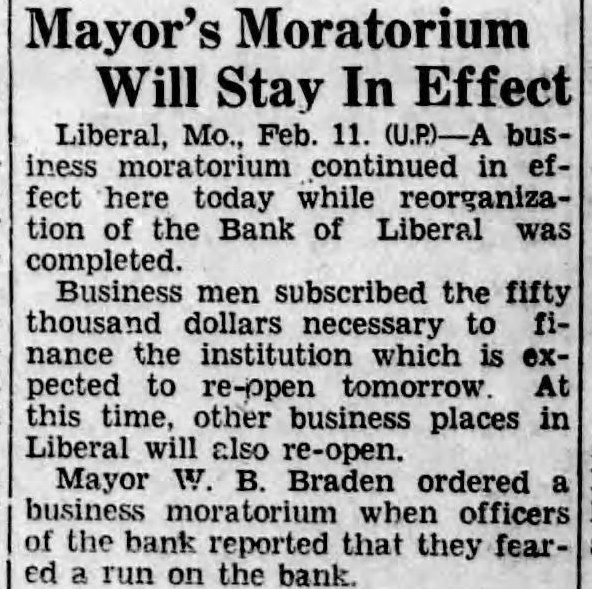 Mayor's Moratorium Will Stay In Effect Liberal, Mo., Feb. fect here today while of the Bank of Liberal completed. Business men subscribed the nance the institution which pected re-open tomorrow this time, business places Liberal also re-open. Mayor Braden ordered moratorium when officers the bank reported that they fearthe bank.