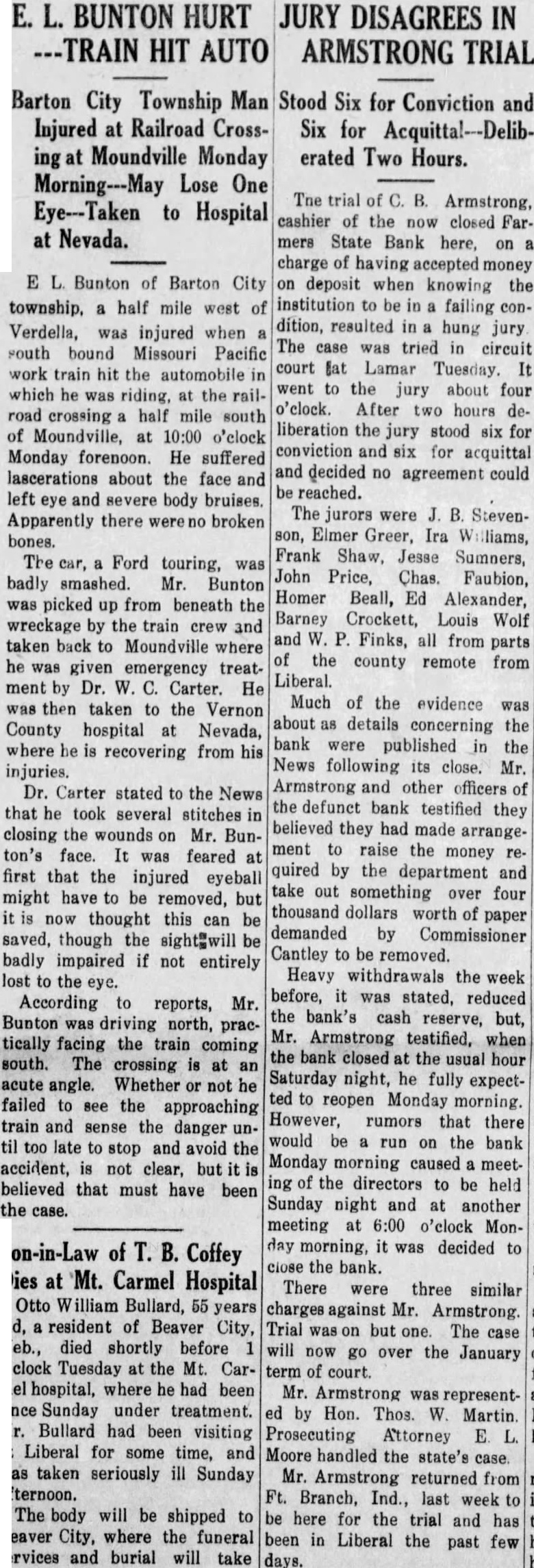 E. L. BUNTON HURT JURY DISAGREES IN TRAIN HIT AUTO ARMSTRONG TRIAL Barton City Township Man Injured at Railroad Crossing at Moundville Monday Morning---May Lose One Eye---Taken to Hospital at Nevada. E L. Bunton of Barton City township, a half mile west of Verdella, was injured when a south bound Missouri Pacific work train hit the automobile in which he was riding, at the railroad crossing a half mile south of Moundville, at 10:00 o'clock Monday forenoon. He suffered lascerations about the face and left eye and severe body bruises. Apparently there were no broken bones. The car, a Ford touring, was badly smashed. Mr. Bunton was picked up from beneath the wreckage by the train crew and taken back to Moundville where he was given emergency treatment by Dr. W. C. Carter. He was then taken to the Vernon County hospital at Nevada, where he is recovering from his injuries. Dr. Carter stated to the News that he took several stitches in closing the wounds on Mr. Bunton's face. It was feared at first that the injured eyeball might have to be removed, but it is now thought this can be saved, though the sight"will be badly impaired if not entirely lost to the eye. According to reports, Mr. Bunton was driving north, practically facing the train coming south. The crossing is at an acute angle. Whether or not he failed to see the approaching train and sense the danger until too late to stop and avoid the accident, is not clear, but it is believed that must have been the case. Stood Six for Conviction and Six for Acquitta!--Deliberated Two Hours. The trial of C. B. Armstrong, cashier of the now closed Farmers State Bank here, on a charge of having accepted money on deposit when knowing the institution to be in a failing condition, resulted in a hung jury The case was tried in circuit court lat Lamar Tuesday. It went to the jury about four o'clock. After two hours deliberation the jury stood six for conviction and six for acquittal and decided no agreement could be reached. The jurors were J. B. Stevenson, Elmer Greer, Ira Williams, Frank Shaw, Jesse Sumners, John Price, Chas. Faubion, Homer Beall, Ed Alexander, Barney Crockett, Louis Wolf and W. P. Finks, all from parts of the county remote from Liberal. Much of the evidence was about as details concerning the bank were published in the News following its close. Mr. Armstrong and other officers of the defunct bank testified they believed they had made arrangement to raise the money required by the department and take out something over four thousand dollars worth of paper demanded by Commissioner Cantley to be removed. Heavy withdrawals the week before, it was stated, reduced the bank's cash reserve, but, Mr. Armstrong testified, when the bank closed at the usual hour Saturday night, he fully expectted to reopen Monday morning. However, rumors that there would be a run on the bank Monday morning caused a meeting of the directors to be held Sunday night and at another meeting at 6:00 o'clock Monday morning, it was decided to close the bank. There were three similar charges against Mr. Armstrong. Trial was on but one. The case will now go over the January term of court. Mr. Armstrong was represented by Hon. Thos. W. Martin. Prosecuting Attorney E. L. Moore handled the state's case. Mr. Armstrong returned from Ft. Branch, Ind., last week to be here for the trial and has been in Liberal the past few days.