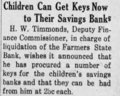 Children Can Get Keys Now to Their Savings Banks H. W. Timmonds, Deputy Finance Commissioner, in charge of liquidation of the Farmers State Bank, wishes it announced that he has procured a number of keys for the children's savings banks and that they can be had from him at 2bc each.