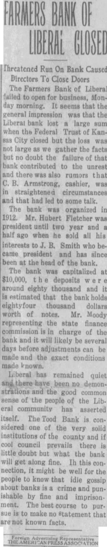FARMERS BANK OF LIBERAL Threatened Run On Bank Caused Directors To Close Doors The Farmers Bank of Liberal failed to open for business, Monday morning. It seems that the general impression was that the Liberal bank lost a large sum when the Federal Trust of Kansas City closed but the loss was not large as we gather the facts but no doubt the failure of that bank contributed to the unrest and there was also rumors that C. B. Armstrong, cashier, was in straightened circumstances and that had led to some talk. The bank was organized in 1912. Mr. Hubert Fletcher was president until two year and a half ago when he sold all his interests to J. B. Smith who became president and has since been at the head of the bank. The bank was capitalized at $10,000, the deposits W er e around eighty thousand and it is estimated that the bank holds eightyfour thousand dollars worth of notes. Mr. Moody representing the state finance commission is in charge of the bank and it will likely be several days before adjustments can be made and the exact conditions made known. Liberal has remained quiet there have been no demonstrations and the good common sense of the people of the Liberal community has asserted itself. The Tood Bank is considered one of the very solid institutions of the county and if cool council prevails there is little doubt but what the bank will get along fine. Ih this connection, it might be well for the people to know that idle gossip about banks is a crime and punishable by fine and imprisonment. The best course to pursue is to make no statement that are known facts. Advertising THE PRESS