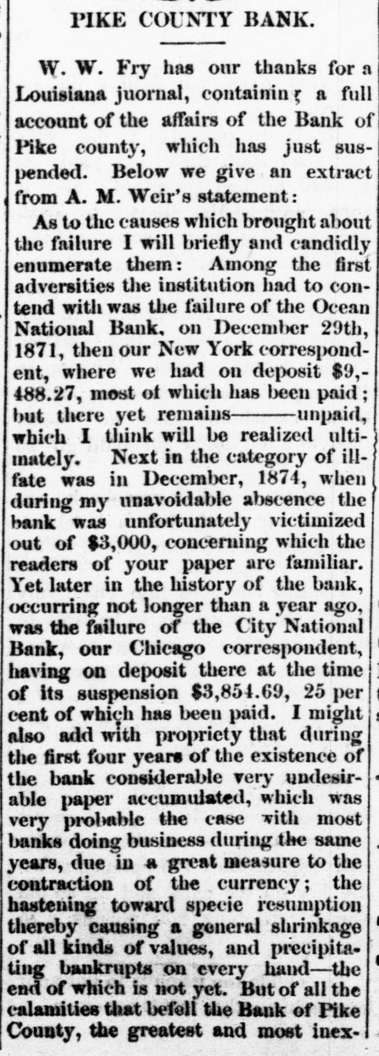 # PIKE COUNTY BANK. W. W. Fry has our thanks for a Louisiana juornal, containing a full account of the affairs of the Bank of Pike county, which has just suspended. Below we give an extract from A. M. Weir's statement: As to the causes which brought about the failure I will briefly and candidly enumerate them: Among the first adversities the institution had to contend with was the failure of the Ocean National Bank, on December 29th, 1871, then our New York correspondent, where we had on deposit $9,488.27, most of which has been paid; but there yet remains—unpaid, which I think will be realized ultimately. Next in the category of ill-fate was in December, 1874, when during my unavoidable abscence the bank was unfortunately victimized out of $3,000, concerning which the readers of your paper are familiar. Yet later in the history of the bank, occurring not longer than a year ago, was the failure of the City National Bank, our Chicago correspondent, having on deposit there at the time of its suspension $3,854.69, 25 per cent of which has been paid. I might also add with propriety that during the first four years of the existence of the bank considerable very undesirable paper accumulated, which was very probable the case with most banks doing business during the same years, due in a great measure to the contraction of the currency; the hastening toward specie resumption thereby causing a general shrinkage of all kinds of values, and precipitating bankrupts on every hand—the end of which is not yet. But of all the calamities that befell the Bank of Pike County, the greatest and most inex-