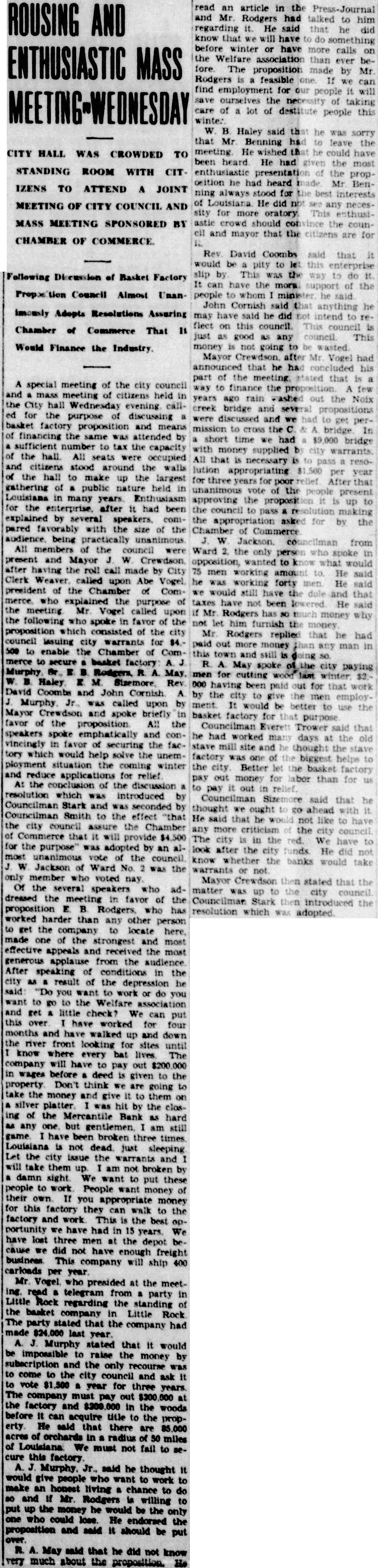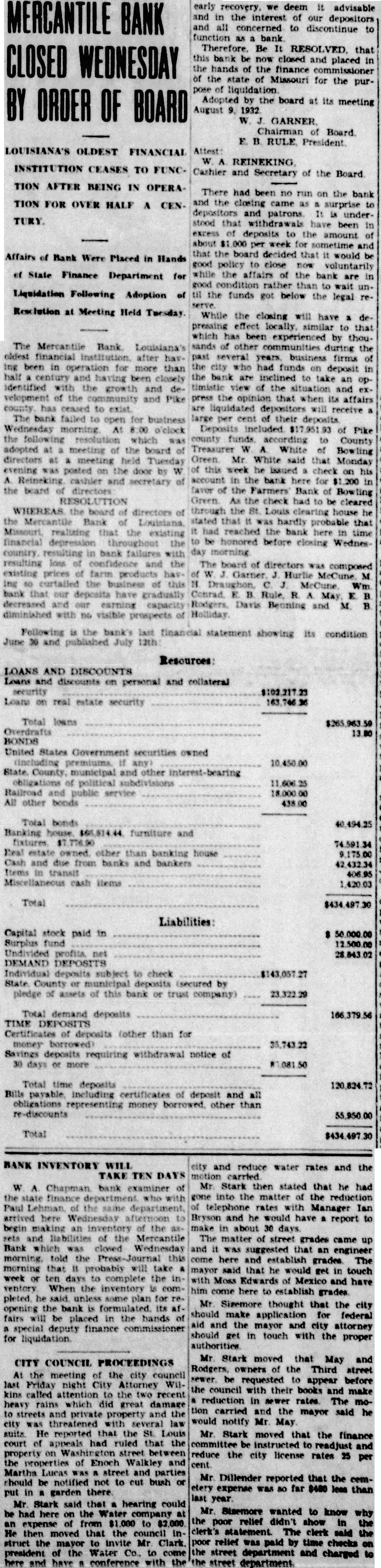 LOUISIANA'S OLDEST FINANCIAL INSTITUTION CEASES TO FUNC- TION AFTER BEING IN TION FOR OVER HALF TURY. Affairs of Bank Were Placed in Hands State Finance Department for Liquidation Following Adoption of Meeting Held Tuesday. The Mercantile Louisiana's oldest financial after havbeen in operation for more than half century and having been closely identified growth and velopment of the and Pike county has ceased to The bank failed to for business open morning. At o'clock the following resolution which was adopted meeting the board directors at meeting held Tuesday evening was posted on the door by cashier and secretary the board directors RESOLUTION WHEREAS the board directors the Mercantile Bank of realizing that the existing financial depression resulting in bank failures resulting confidence and the existing prices farm products curtailed business of this bank that our have gradually decreased and our earning diminished with no visible prospects early recovery, we deem advisable the interest of our depositors and all concerned to discontinue to function Be that bank now closed and in placed the hands the finance commissioner the state of Missouri for the purliquidation Adopted by board its meeting August 1932 Attest Chairman Board. RULE President REINEKING Cashier and Secretary of the Board There had been no run on the bank and the closing came surprise depositors understood that withdrawals have been excess of deposits amount about per week for that the board decided that would good policy close now voluntarily while the affairs of the bank good rather than the funds got below the legal While the closing will have pressing effect similar to that which has been experienced by thousands of other communities during the past several business firms the had funds deposit the bank inclined take an timistic view the and press the opinion that when its affairs liquidated will receive per cent of their deposits included of Pike county funds according to County Treasurer White of Bowling Green Mr White said that Monday this week he issued check on his account bank here for favor of the Farmers Bank of Green As the check had cleared through the clearing house he stated that was hardly probable that had reached the bank here time honored before closing Wednesday morning The board of directors composed Hurlie McCune M Wm Davis Beuning and M. Following the bank's last financial statement showing its condition June and published July BANK INVENTORY WILL TAKE TEN DAYS bank examiner the state finance Paul the arrived here afternoon begin the and liabilities of the Mercantile Bank which closed Wednesday told the Press-Journal this morning that probably will take week ten days complete the ventory When inventory comunless some plan for opening the bank its fairs placed in the hands special deputy finance commissioner liquidation. CITY COUNCIL PROCEEDINGS At the meeting the city council last Friday night City Attorney Wilkins called attention the recent heavy rains which did great damage streets private property the city was threatened with several law He reported that the St. Louis court appeals ruled that the property Washington street properties of Enoch Walkley Marths Lucas street parties should be notified not to cut bush put in garden Mr. Stark said that hearing could had on the expense from to He moved that the struct the mayor to Mr. Clark. president the Water Co., and have conference with the city and reduce water rates and the carried Mr. Stark then stated that he had gone into matter of the reduction telephone rates Manager Bryson and he would have report to make in about 30 The matter street grades came up and suggested that an engineer here and establish grades. The mayor said that he would get in touch Moss Edwards Mexico and have come here to establish grades. Mr Sizemore thought that the city should make application for federal aid and the mayor and city attorney should in touch with the proper authorities Mr Stark moved that May and Rodgers, owners of the Third street be requested to appear before the council with their books and make reduction sewer rates The motion carried and the mayor said he would notify Mr. Stark moved that the finance committee instructed and reduce the city license rates per cent. Mr. Dillender reported that the cemetery expense was far less than last year. Mr. wanted to know why the poor relief didn't show the The clerk said the relief paid by time checks street department and charged street Resources: LOANS AND DISCOUNTS Loans discounts on personal and collateral security Loans on real estate security Total loans Overdrafts BONDS United States Government securities owned any) 10,450.00 State County, municipal and other obligations political subdivisions and public service 18,000.00 All other bonds 438.00 Total bonds Banking furniture and Real estate owned. other than banking house Cash and due from banks and bankers Items transit Miscellaneous cash items 1,420.03 Total Liabilities: Capital stock paid in fund Undivided profits DEMAND DEPOSITS Individual deposits subject to check $143,057.27 State County or municipal deposits (secured by pledge assets of this bank or trust company) 23,322.29 Total demand deposits TIME DEPOSITS Certificates deposits (other than for money 35,743.22 Savings deposits requiring withdrawal notice of days more Total time deposits 120,824.72 Bills payable. including certificates of deposit and all obligations representing money borrowed. other than re-discounts 55,950.00 Total
