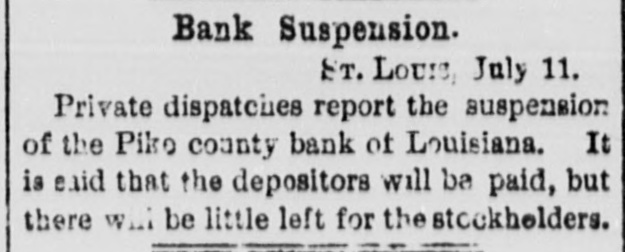 Bank Suspension. ET. Louis July 11. Private dispatclies report the suspension of the Piko county bank of Louisiana. It is exid that the depositors will be paid, but there will be little left for the stockholders.