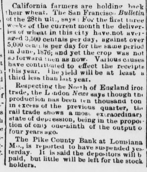 California farmers are holding hack their wheat. The San Francisco Bulletin of the 28th ult., says: For the first turee weeks of the current month the deliveries of wheat in this city have.not avel aged 3,500 centais per day, against over 5,000 centers per day for the sawe period in June, 1876; and yet the crop was not SJ forward then as now. Various causes have contributed to effect the receipts this year. i he yield will be at least a third less than last year. Respecting the North of England iron trade, the L ondon News says though the production has been ten thousand ton in excess of the previous quarter, the rail trade shows a most extraordinary state of depression, being in the propor. tion of only one-ninth of the output O four years ago. The Pike County Bank at Louisiana Mo., is reported to have suspended yes. terday. It is said the depositors will b paid, but little will be left for the stock holders.