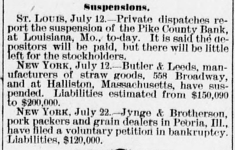 Suspensions. ST. LOUIS, July Private dispatches report the suspension of the Pike County Bank, at Louisiana, Mo., to-day. It is said the depositors will be paid, but there will be little left for the stockholders. NEW YORK, July 12.-Butler & Leeds, manufacturers of straw goods, 558 Broadway, and at Halliston, Massachusetts, have suspended. Liabilities estimated from $150,090 to $200,000. NEW YORK. July 22.Junge & Brotherson, pork packers and grain dealers in Peoria, III., have filed a voluntary petition in bankruptcy. Liabilities, $120,000.