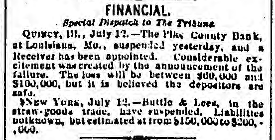 FINANCIAL. Special Disputch to The Tribuna QUINCY, 111., July 1..-The - like County Bank, at Louisiana, Mo., suspended yesterday, and a Receiver has been appointed. Considerable ex. citement was created by the announcement of the failure. The Jose will be between $60, 000 and $100,000. but It is believed the depositors are safe. NEW YORK, July 12.-Buttle & Lees, in the straw.good trade, have respended. Liabilities botknown, butestimated at from 2:150, 000105200, ,000.