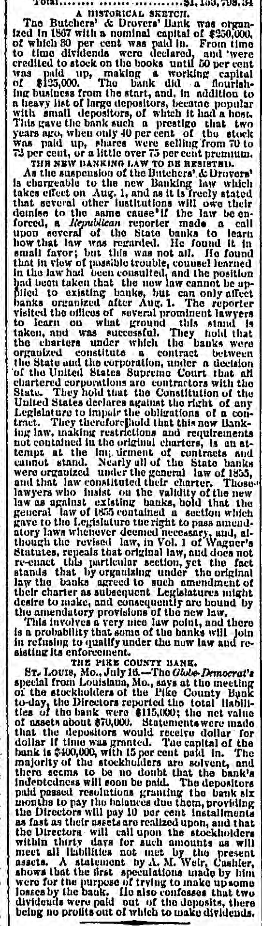 53,708.34 A HISTORICAL SKETCH. Tue Butchers' & Drovers' Bank was organized In 1807 with a nominal capital of $250,000, of which 80 per cent was paid in. From time to time dividends were declared, and were credited to stock on the books until to per cent was paid up, making a working capital of $125,000. The bank did a flourishing business from the start, and. in addition to a heavy list of large depositors, because popular with small depositors, of which it had a host. This gave the bank such a prestigo that two years ago, when only 40 per cent of the stock was paid up, shares were selling from TO to 72 per cent, or a little over 75 per cent prenuum. THE NEW BANKING LAW TO DE RESISTED. As the suspension of the Butchers' & Drovers' is chargeable to the new Banking law which takes effect on Aug. 1, and as it is freely stated that several other Institutions will owe their demise to the same cause' If the law be enforced, a Republican reporter made a call upon several of the State banks to learn how that law was regarded. He found It in email favor; but this was not all. He found that in view of possible trouble, cousel learned In the law had been consulted, and the position had been taken that the new law cannot be upfiled to existing banks, but can only affect banks organized after Aug. 1. The reporter visited the offices of several prominent lawyers to learn ou what ground this stand is taken, and was successful. They hold that the charters under which the banks were organized constitute a contract between the State and the corporation, under a decision of the United States Supreme Court that all chartered corporations are contractors with the State. They hold that the Constitution of the United States declares against the right of any Legislature to impair the obligations of a contract. They therefore Shold that this now Banking law. making restrictions and requirements not contained in the original charters, is an attempt at the Im: urment of contracts and cannot stand. Nearly all of the State banks were organized under the general law of 1835, and that law constituted their charter. Those lawyers who Insist ou the validity of the new law as against existing banks, hold that the general law of 1855 contained a section which gave to the Legislature the right to pass amendatory laws whenever deemed necessary, and, although the revised law, in Vol. 1 of Waguer's Statutes, repeals that original law, and does not re-enact this particular section, yet the fact stands that by organizing under the original law the banks agreed to such amendment of their charter as subsequent Legislatures might desire to make, and consequently are bound by the amendatory provisions of the new law. This involves n very nico law point, and there is a probability that some of the banks will Join in refusing to qualify under the nuw law and resisting its enforcement. THE PIKE COUNTY BANK. LOUIS, Mo., July 16.-The Glube Democrat's special from Louisiatia, Mo., says at the meeting 01 the stockholders of the Piko County Bank to-day, the Directors reported the total liabilities of the bank were $115,000; the net value of assets about 870,000. Statements were made that the depositors would receive dollar for dollar If time was granted. The capital of the bank is $400,000, with 15 por cent paid in. The majority of the stockholders are solvent, and there seems to be no doubt that the bank's Indeptedness will eoon be paid. The depositors paid passed resolutions granting the bank six months to pay the balances due them, providing the Directors will pay 10 por cent Installments as fast as their assets are realized upon, and that the Directors will call upon the stockholders within thirty days for such amounts us will meet all liabilities not met by the present assets. A statement by A. M. Weir, Cashier, shows that the first speculations ulade by him were for the purpose of trying to make upsome Josesa by the bauk. lle also confesses that two divideuds were paid out of the deposits, there being no profits out of which to wake dividends.