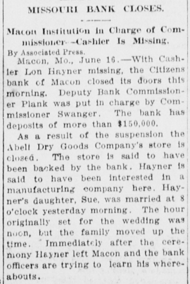 MISSOURI BANK CLOSES. Macon Institution in Charge of Commissioner - -Cashier Is Missing. By Associated Press. Macon, Mo., June 16.-With Cash1er Lon Hayner missing, the Citizens bank of Macon closed its doors this morning. Deputy Bank Commissioner Plank was put in charge by Commissioner Swanger. The bank has deposits of more than $150,000. As a result of the suspension the Abell Dry Goods Company's store is closed. The store is said to have been backed by the bank. Hayner is said to have been interested in a manufacturing company here. Hayner's daughter, Sue, was married at 8 o'clock yesterday morning The hour originally set for the wedding was noon, but the family moved up the time. Immediately after the ceremony Hayner left Macon and the bank officers are trying to learn his whereabouts.