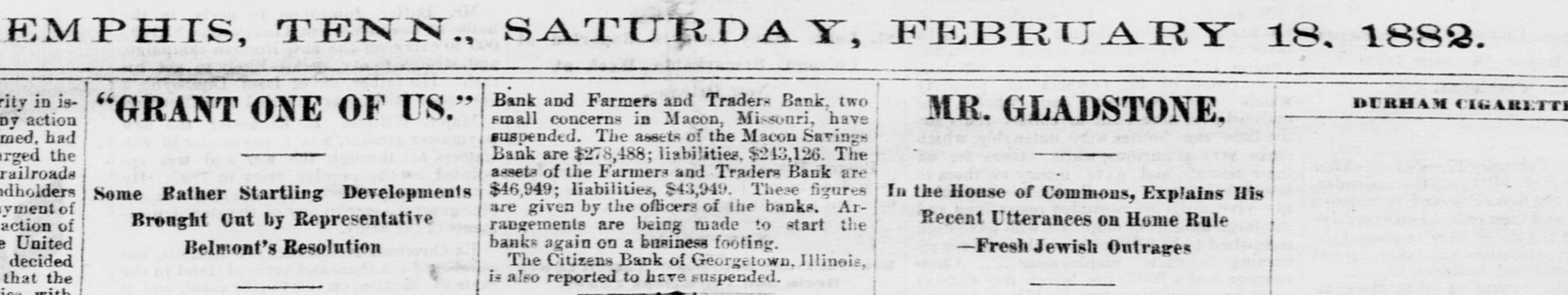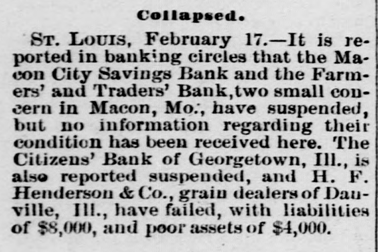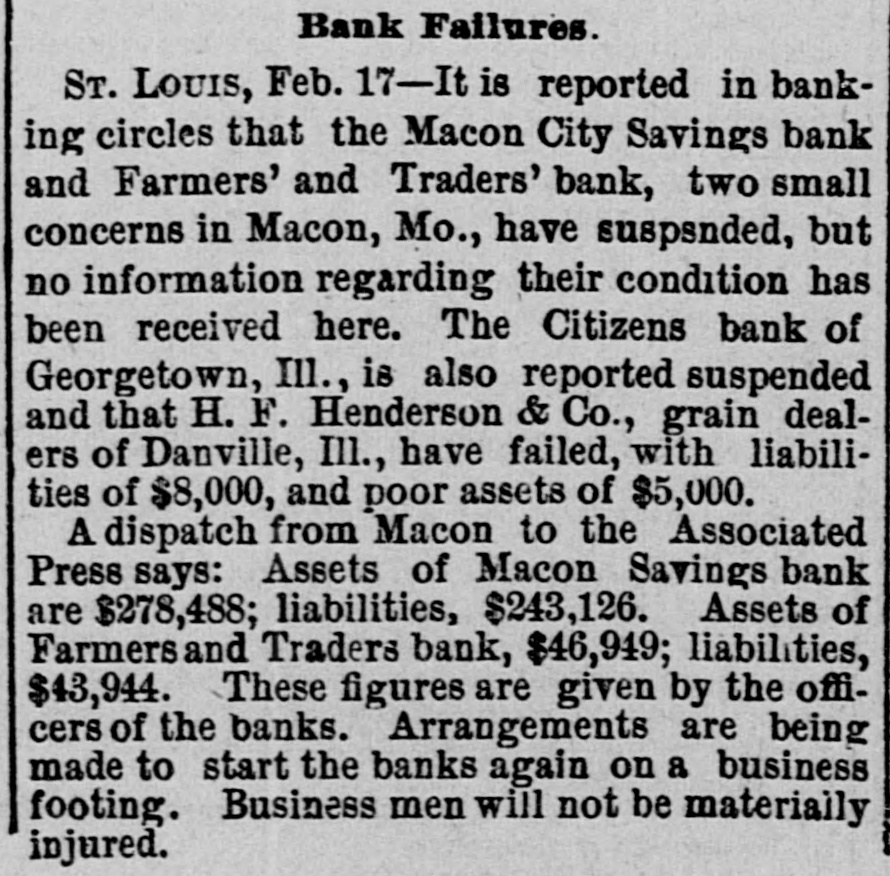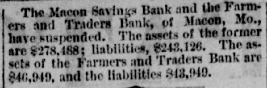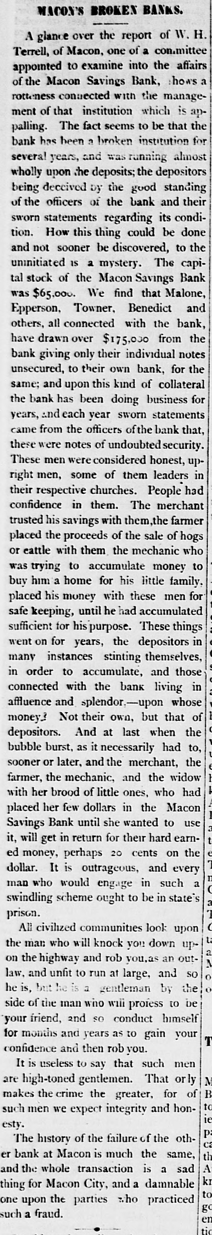 MACON'S BROKEN BANKS. A giance over the report of W.H. Terrell, of Macon, one of a con.mittee appointed to examine into the affairs of the Macon Savings Bank, hows a rotteness connected with the management of that institution which is appalling. The fact seems to be that the bank has been a broken institution for several years, and running almost who!ly upon the deposits; the depositors being deceived by the good standing of the officers of the bank and their sworn statements regarding its condition. How this thing could be done and not sooner be discovered, to the uninitiated is a mystery. The capital stock of the Macon Savings Bank was $65,000. We find that Malone, Epperson, Towner, Benedict and others, all connected with the bank, have drawn over $175,000 from the bank giving only their individual notes unsecured, to their own bank, for the same; and upon this kind of collateral the bank has been doing business for years, and each year sworn statements came from the officers of the bank that, these were notes of undoubted security. These men were considered honest, upright men, some of them leaders in their respective churches. People had confidence in them. The merchant trusted his savings with them the farmer placed the proceeds of the sale of hogs or eattle with them the mechanic who was trying to accumulate money to buy him a home for his little family. placed his money with these men for safe keeping, until he had accumulated sufficient for his purpose. These things went on for years, the depositors in many instances stinting themselves, in order to accumulate, and those connected with the bank living in affluence and splendor.-upon whose money? Not their own, but that of depositors. And at last when the bubble burst, as it necessarily had to, sooner or later, and the merchant, the farmer, the mechanic, and the widow I with her brood of littleones,who had placed her few dollars in the Macon I Savings Bank until she wanted to use a t it, will get in return for their hard earned money, perhaps 20 cents on the : dollar. It is outrageous, and every I man who would engage in such a swindling scheme ought to be in state's a prison. ( All civilized communities look upon t the man who will knock you down upa on the highway and rob you as an outM law, and unfit to run at large, and SQ o o he is, but he is a gentleman by the side of the man who will profess to be your friend, and so conduct himself for months and years as to gain your T confidence and then rob you. It is useless to say that such men M are high-toned gentlemen. That or ly E makes the crime the greater, for of to such men we expect integrity and hon16 esty. p The history of the failure of the othca er bank at Macon is much the same, t A and the whole transaction is a sad k thing for Macon City, and a damnable to one upon the parties who practiced g such a fraud. en ti