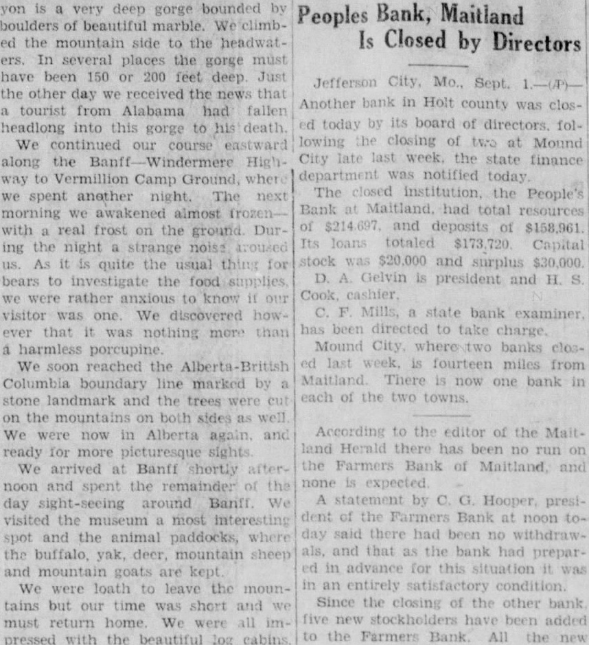 Peoples Bank, Maitland Is Closed by Directors Jefferson City, Mo., Sept. Another bank in Holt county was clostoday by its board of directors. following the closing of two at Mound City late last week. the state finance department was notified today. The closed institution. the People's Bank Maitland, had total resources of and deposits of $158,961 Its loans totaled $173,720 Capital stock was $20,000 and surplus $30,000. D. Gelvin is president and H. S. Cook Mills, a state bank examiner, has been directed to take charge. Mound City, where banks closlast week, is fourteen miles from Maitland. There is now one bank in each of the two towns. According to the editor of the Maitland Herald there has been no run on the Farmers Bank of Maitland, and none expected statement by Hooper, president of the Farmers Bank at noon day said there had been no withdrawand that as the bank had preparin advance for this situation it was an entirely satisfactory condition. Since the closing of the other bank five new stockholders have been added the Farmers Bank. All the