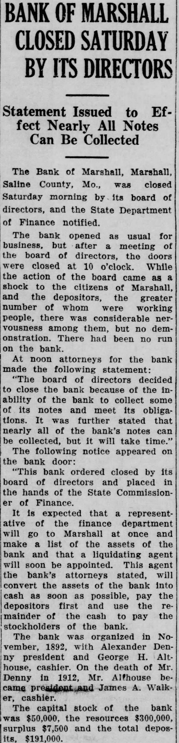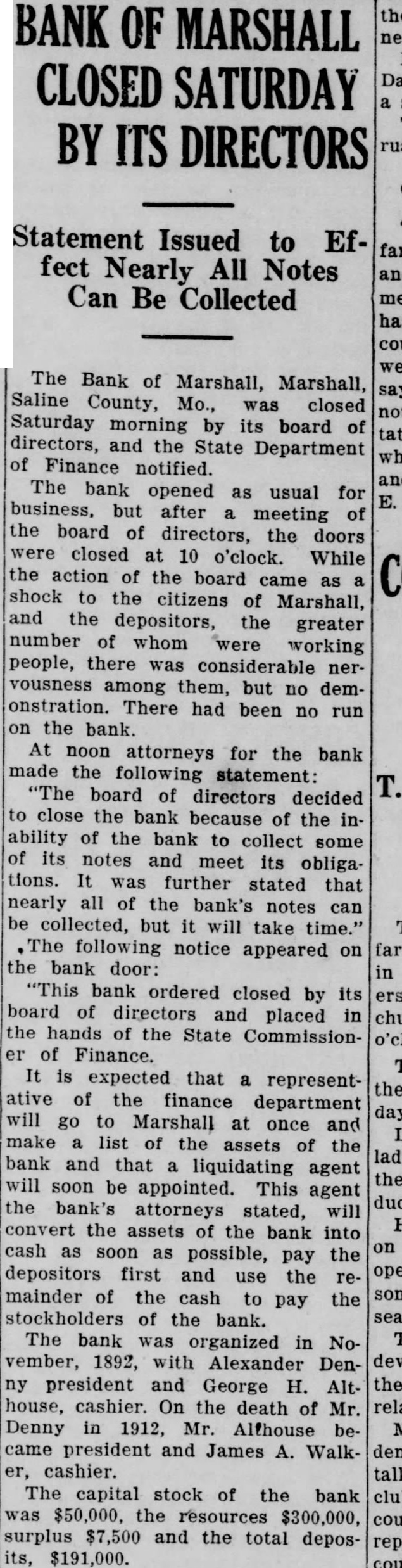 OF MARSHALL Statement Issued to Effect Nearly All Notes Can Be Collected The Bank of Marshall, Marshall, Saline County, Mo., was closed Saturday morning by its board directors, and the State Department of Finance notified. The bank opened usual for but after meeting of the board directors, the doors closed 10 o'clock. While the action of the board came shock to the citizens of Marshall, and the depositors, the greater number whom were working people, there considerable vousness among them, but no onstration. There had been no the bank. At noon attorneys for the bank the following statement: board of directors decided close the bank because the ability the bank to collect some its notes meet its obligations. further stated that nearly all of the bank's notes can collected, but will take The following notice appeared the bank door: ordered closed by its board directors and placed the hands of the State Commissionof Finance. expected that representative of the finance department go to Marshall once and make list of the assets of the bank and that liquidating agent soon appointed. This agent the bank's attorneys stated, will convert the assets the bank soon as possible, pay the depositors first and use the mainder of the cash to pay the of the bank. The bank organized vember, 1892, with Alexander president and George H. Althouse, cashier. On the death of Mr. Denny 1912, Mr. Althouse James cashier. The capital stock the bank $50,000, the surplus and the total $191,000.