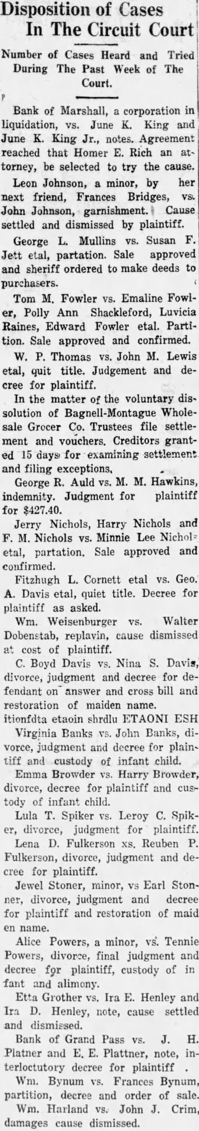 Bank of Marshall, liquidation June King June King, Cause set for trial November Gilliam Bank, and Bank Slater, Hargrove Powell, Bessie George Powell, Maurene Summers, Louis M. Williams, Emma Irwin, Irean Oliver, Jenkins, Trustee, Henry Powell, and Powell. agreement continued January Mary Shackelford Sullivan. Equity. By agreement cause dismissed cost defend-