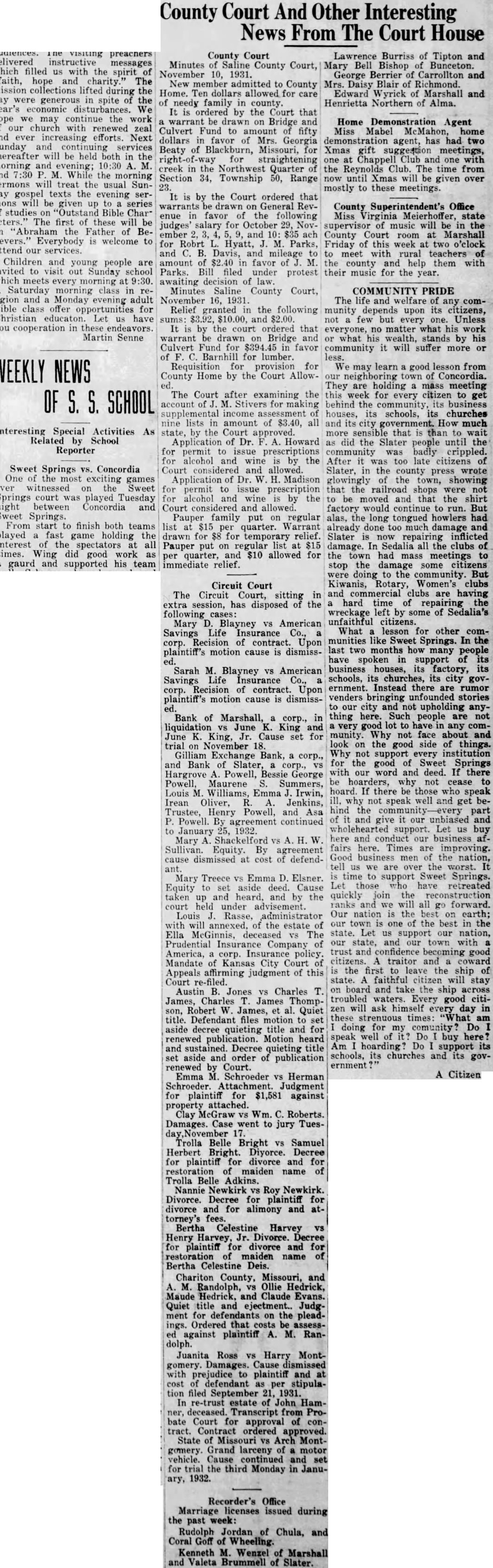 County Court Minutes Saline County Court, November 10, 1931. New member admitted to County Home. dollars allowed for care of needy family county It ordered by the Court that warrant drawn on Bridge Culvert Fund to amount fifty dollars favor Mrs. Georgia Beaty Blackburn, Missouri, straightening the Northwest Quarter Section Township Range by the Court ordered that drawn enue favor following judges salary for October ember and $35 ach for Robrt Hyatt, Parks, and Davis, and mileage amount favor Parks. Bill filed under protest awaiting Minutes Saline County Court, November Relief granted the following and $2.00. It by the court ordered that warrant drawn Bridge Culvert Fund for in favor of Barnhill for lumber. Requisition provision for County Home by the Court Allow-
