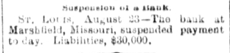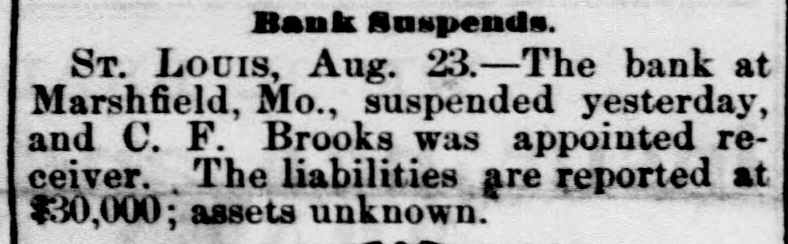 Bank Suspends. ST. LOUIS, Aug. 23.-The bank at Marshfield, Mo., suspended yesterday, and C. F. Brooks was appointed receiver. The liabilities are reported at $30,000; assets unknown.