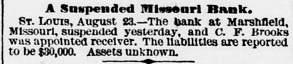 A Suspended Missouri Bank. ST. LOUIS, August 23.-The bank at Marshfield, Missouri, suspended yesterday, and C. F. Brooks was appointed receiver. The liabilities are reported to be $30,000. Assets unknown.