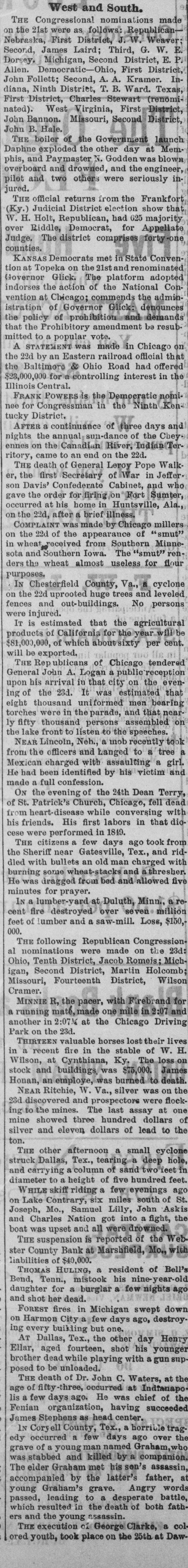 District election show tha Republican, had 625 majority Democrat, for Appellat he district comprises forty on Democrats met in State Conver on the 21st and renominate Glick. The platform adopte he action of the National Cor Chicago; commends the admin of Governor Glick: denounce of prohibition and demand rohibitory amendment be resub popular vote. EMENT was made in Chicago 0 an Eastern railroad official the & Ohio Road had offere for a controlling interest in th POWERS is the Democratic nomi ngressman in the Ninth Ken VII continuance of three days an annual sun-dance of the Chey Canadian River, Indian Te 11 to an end on the 22d. of General Leroy Pope Wall Secretary of War in Jeffer Confederate Cabinet, and wh for firing on Fort Sumter his home in Huntsville, Ala after a brief illness. was made by Chicago miller of the appearance of "smut received from Southern Minne Southern Iowa. The "smut" rer almost useless for flou sterfield County, Va., a cyclon uprooted huge trees and levele out-buildings. No person stimated that the agricultura California for the year 111 k of which aboutsixty per cent ported. ublicans of Chicago tendere A. Logan a public receptic arrival in that city on the ever 23d. It was estimated tha uniformed men bearin in the parade, and that nea nousand persons assembled o to listen to the speeches. incoln, Neh., a mob recently too officers and Langed to a tree charged with assaulting a gir identified by his victim an confession. evening of the 24th Dean Terry rick's Church, Chicago, fell dea t-disease while conversing wit His first labors in that di performed in 1849. a few days ago took fro near Gatesville, Tex., and ri bullets an old man charged with wheat-stacks and a threshe ragged from bed and allowed fi for prayer. nber-yard at Duluth, Minn., a r destroyed over seven millio and a saw-mill. Loss, $15 lowing Republican Congressio were made on the 23 District, Jacob Romeis; Mic District, Martin Holcom Fourteenth District, Wils R, the pacer, with Firebr and f mate,made one mile in 2:07 at 2:07 % at the Chicago Drivir 23d. valuable horses lost their liv fire in the stable of W. ] Cynthiana, Ky. The loss ( buildings, was $75,000. Jam employe, was burned to deat Ritchie, W. Va., silver was on t and prospectors were floe mines. The last assay at of three hundred dollars eleven dollars of lead to t afternoon a small cyclo Tex., tearing a deep hol a column of sand two feet to a height of five hundred fee skiff riding a few evenings a Contrary, six miles south of S Mo., Samuel Lilly, John Ask Nation got into a fight, t # upset and all were drowned. spension is reported of the We Bank at Marshfield, Mo., wi of $40,000. HULING, a resident of Bel mistook his nine-year-o for a burglar a few nights a dead. her fires in Michigan swept dov City a few days ago, destro building but one. Tex., the other day Hen fourteen, shot his young while playing with a gun su be unloaded. of Dr. John C. Waters, at t ty-three, occurred at Indianap days ago. He was chief of t organization, having succeed ephens as head center. ell County, Tex., a horrible tra