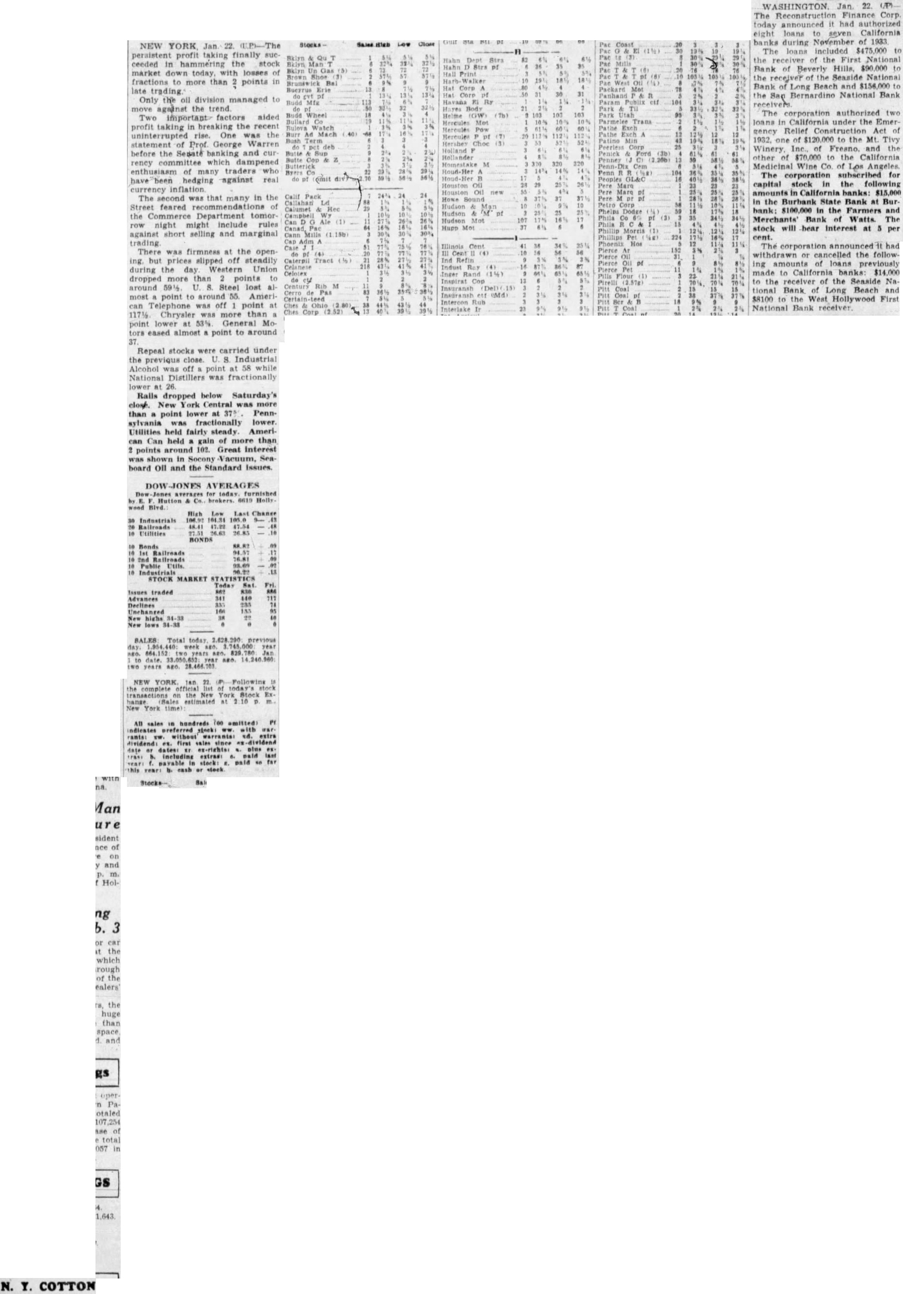 WASHINGTON, Dec. 22. (P)-A suggestion for investigation of the Reconstruction Finance Corporation was made today in the Senate at about the same time that a report reached Congress that the corporation had authorized advances of in November. Senator Norris of Nebraska made the suggestion after he had read magazine article in the Senate telling of operations of the corporation. He did not offer resolution for the investigation but said such study should be made to let the country know what was being done with the millions of dollars of taxpayers' money. LOANS REPORTED ON The corporation's report related that $71,541,854 of loans had been authorized to banks in November and that of the remainder of the total advances authorized during the month, $18,687,373 had been to Governors for relief work in different States. Of the $71,541,854 authorized to financial institutions, the report said, $22,258,996 was for banks and trust companies, including $2,836,500 to aid in the reorganization or liquidation of closed banks; $3,376,199 to building and loan associations; $2,151,000 to insurance companies; $2,730,800 to mortgage loan companies; $66,746 to credit union; $2,126,000 to joint stock land banks; $132,547 to agricultural credit corporations; $473,565 to livestock credit corporations; $38,226,000 to railroads, including $1,500,000 to railroad receiver. INTEREST 5½ PER CENT Most of the loans to the financial institutions were at 5½ per cent interest, with some to receivers of banks at per cent, The report showed cash balance of $5,824,931 in the corporation's treasury at the close of business November 30, and that during the month it sold to the United States Treasury $25,000,000 in notes. During November, the report said, the corporation paid in $6,000,000 as capital of regional agricultural credit corporations During November, the corporation's of $2,500,000 to the Secretary of Agriculture for crop production loans brought the total authorized advances for this purpose to $120,000,000. The report said $15,000,000 of this amount had been returned. PUBLICITY DEFEATED Norris told the Senate those favoring complete publicity of the corporation activities had been "defeated" in that purpose. He quoted from the article to the effect that "hundreds of millions had been passed around" without Congress knowing who received it. The article from which the Nebraskan read said of $264,000,000 loaned to railroads, $156,000,000 went to three groups-" Morgan, Van Sweringen and Pennsylvania Railroad interests. Loans authorized to banks and trust companies during November included: California: Beverly Hills (receiver) $515,000; Colton, Citizens National Bank of Colton $25,000; Corona, Citizens Bank $25,000; Fullerton, First National Trust and Savings Bank of Fullerton $85,000; Laguna Beach, Citizens Bank of Laguna Beach $17,500. Los Angeles: West Hollywood First National Bank (receiver) $33,000; Wilshire National Bank of Los Angeles $10,000.