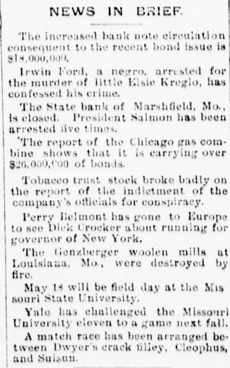 NEWS IN BRIEF. The increased bank note circulation consequent to the recent bond issue is $18,000,000. Irwin Ford, a negro, arrested for the murder of little Elsie Kreglo, has confessed his crime. The State bank of Marshfield, Mo., is closed. President Salmon has been arrested five times. The report of the Chicago gas combine shows that it is earrying over $26,000,000 of bonds. Tobacco trust stock broke badly on the report of the indictment of the company's officials for conspiracy. Perry Belmont has gone to Europe to see Dick Crocker about running for governor of New York. The Genzberger woolen mills at Louisiana, Mo., were destroyed by fire. May 18 will be field day at the Mis souri State University. Yale has challenged the Missouri University eleven to a game next fall. A match race has been arranged between Dwyer's crack filley, Cleophus, and Suisun.
