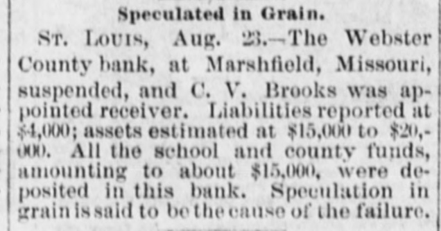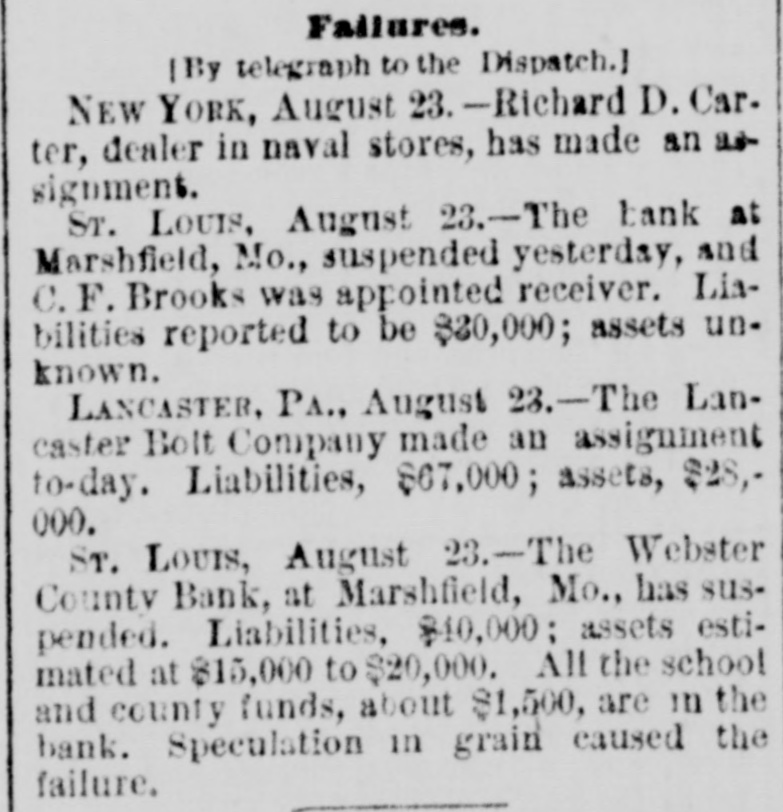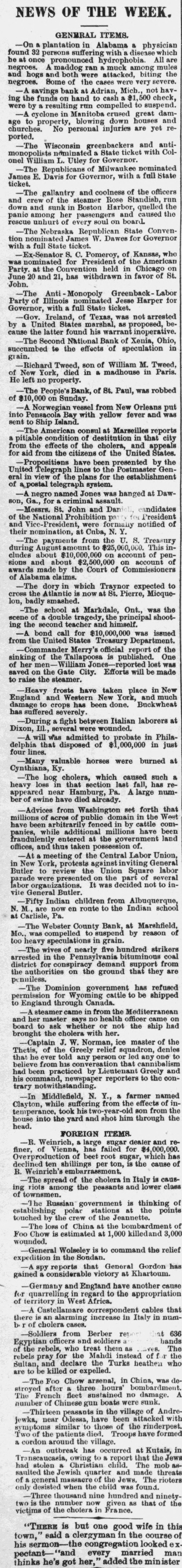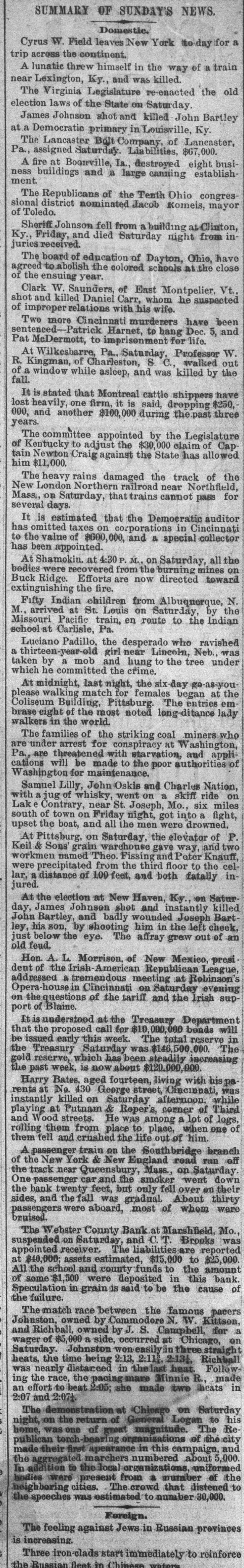 Cyrus W. Field leaves New York tolday for a trip across the continent. A lunatic threw himself in the way of a train near Lexington, Ky., and was killed. The Virginia Legislature re-enacted the old election laws of the State on Saturday. James Johnson shot and killed John Bartley at a Democratic primary in Louisville, Ky. The Lancaster Bolt Company, of Lancaster, Pa., assigned Saturday. Liabilities, $67,000. A fire at Boonville, Ia., destroyed eight business buildings and a large canning establishment. The Republicans of the Tenth Ohio congressional district nominated Jacob Komeis, mayor of Toledo. Sheriff Johnson fell from a building at-Clinton, Ky., Friday, and died Saturday night from injuries received. The board of education of Dayton, Ohio, have agreed to abolish the colored schools at the close of the ensuing year. Clark W. Saunders, of East Montpelier, Vt., shot and killed Daniel Carr, whom he suspected of improper relations with his wife. Two more Cincinnati murderers have been sentenced-Patrick Harnet, to hang Dec. 5, and Pat McDermott, to imprisonment for life. At Wilkesbarre, Pa., Saturday, Professor W. R. Kingman, of Charleston, S. C., walked out of fall. a window while asleep, and was killed by the It is stated that Montreal cattle shippers have lost heavily, one firm, it is said, dropping $250, 000, and another $100,000 during the past three years. The committee appointed by the Legislature of Kentucky to adjust the $30 000 claim of Captain Newton Craig against the State has allowed him $11,000. The heavy rains damaged the track of the New London Northern railroad near Northfield, Mass, on Saturday, that trains cannot pass for several days. It is estimated that the Demoeratic auditor has omitted taxes on corporations in Cincinnati to the value of $600,000, and a special collector has been appointed. At Shamokin. at 4:30 M., on Saturday, all the bodies were recovered from the burning mines on Buck Ridge. Efforts are now directed toward extinguishing the fire. Fifty Indian children from Albuquerque, N. M., arrived at St. Louis on Saturday, by the Missouri Pacific train, en route to the Indian school at Carlisle, Pa. Luciano Padillo, the desperado who ravished a thirteen-year-old girl near Lincoln, Neb., was taken by a mob and hung to the tree under which he committed the crime. At midnight, last night, the six day -as-youplease walking match for females began at the Coliseum Building, Pittsburg. The entries embrase eight of the most noted long-ditance lady walkers in the world. The families of the striking coal miners who are under arrest for conspiracy at Washington, Pa, are threatened with starvation, and applications will be made to the poor authorities of Washington for maintenance, Samuel Lilly, Oskis and Charles Nation, with a jug of whisky, went on a skiff ride on Lak e Contrary, near St. Joseph, Mo., six miles south of town on Friday night, got into a fight, upset the boat, and all the men were drowned. At Pittsburg, on Saturday, the elevator of P. Keil & Sons' grain warehouse gave way, and two workmen named Theo. Fissing and Peter Knauff, were precipitated from the third floor to the cellar, a distance of 100 feet, and both fatally injured. At the election at New Haven, Ky. on Saturday, James Johnson shot and instantly killed John Bartley, and badly wounded Joseph Bartley, his son, by shooting him in the left cheek, just below the eye. The affray grew out of an old feud. Hon. A. L. Morrison, of New Mexico, presi dent of the Irish-American Republican League, addressed a tremendous meeting at Robinson's Opera-housein Cincinnati on Saturday evening on the questions of the tariff and the Irish support of Blaine. It is understood at the Treasury Department that the proposed call for $10, bonds will be issued early this week. The total reserve in the Treasury Saturday was $146,500. The gold reserve, which has been steadily increasing the past week, is now about $120,000,000. Harry Bates, aged fourteen, living with hisparents at No. 430 George street, Cincinnati, was instantly killed on Saturday afternoon. while playing at Putnam & Reper's, corner of Third and Wood streets. He was among a lot of logs, rolling them from place to place, when one of them fell and crushed the life out of him. A passenger train on the Southbridge branch of the New York & New England road ran off the track near Queensbury, Mass, on Saturday. One passenger car and the smoker went down the bank twenty feet, but only fell over on their sides, and the fall was gradual About thirty passengers were aboard, most of whom were bruised. The Webster County Bank at Marshfield, Mo., suspended on Saturday, and C.T. Brooks was appointed receiver. The liabilities are reported at $40,000; assets estimated, $15,000 to $25,000. All the school and county funds to the amount of some $1,500 were deposited in this bank. Speculation in grain is said to be the cause of the failure. The match race between the famous pacers Johnston, owned by Commodore N. W. Kittson, and Richball, owned by J. S. Campbell, for a wager of $5,000 a side, occurred at Chicago, on Saturday. Johnston won-easilyin three straight heats, the time being 2:13, 2:111, 2:131, Richball was nearly distarced in thelast heat. Following the race, the pacing-mare Minnie R., made an effort to beat 2:05; she made two Theats in 2:07 and 2:07 The demonstration at Chicago on Saturday night, on the return of General Logan to his home, was one of great magnitude. The Republican torch-bearing organizations of the city made their first apearance in this campaign, and the aggregated marchers numbered about 5,000. In addition to the local organizations, uniformed bodies were present from a number of the neighboring cities. The crowd that distened to the speeches was estimated to number 30,000. Foreign. The feeling against Jews in Russian provinces