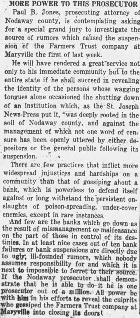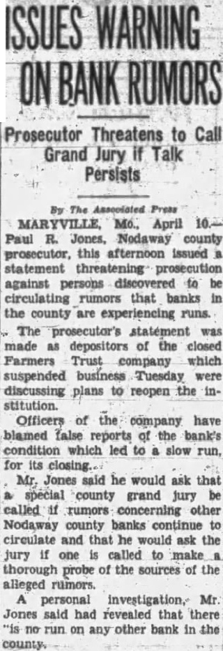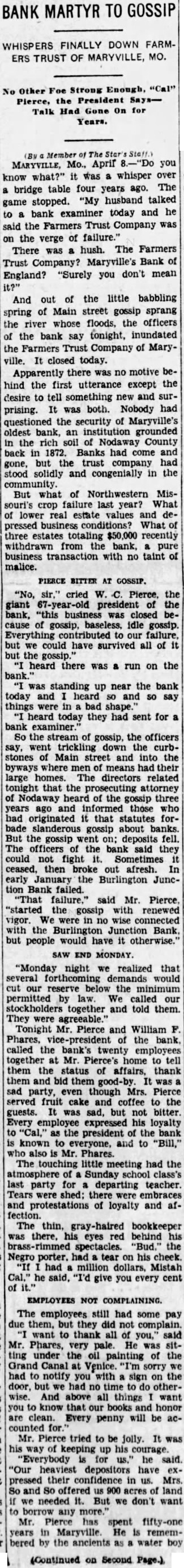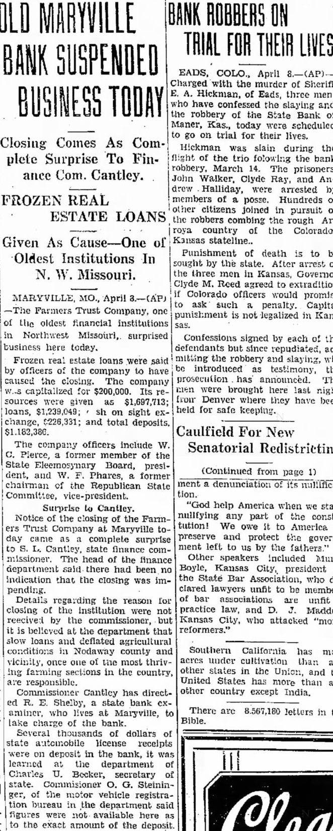 OLD MARYVILLE BANK SUSPENDED BUSINESS TODAY Closing Comes As Complete Surprise To Finance Com. Cantley. FROZEN REAL ESTATE LOANS Given As Cause-One of Oldest Institutions In N. W. Missouri. if Colorado officers would promise MARYVILLE MO., April 3.-(AP) to ask such a penalty. Capital -The Farmers Trust Company, one punishment is not legalized in Kanof the oldest financial institutions sas. in Northwest Missouri, surprised Confessions signed by each of the business here today. defendants but since repudiated, ad. Frozen real estate loans were said mitting the robbery and slaying, will by officers of the company to have be introduced as testimony, the prosecution has announced. The caused the closing. The company W.S capitalized for $200,000. Its re- men were brought here last night from Denver where they have been sources were given as $1,697,713; held for safe keeping. loans, $1,239,049; sh on sight exchange, $226,331; and total deposits. Caulfield For New The company officers include W. Senatorial Redistricting C. Pierce, a former member of the State Eleemosynary Board, presi(Continued from page 1) dent, and W. F. Phares, a former chairman of the Republican State ment a denunciation of its mullification. Committee, vice-president. "God help America when we start Surprise to Cantley. nullfying any part of the constlNotice of the closing of the Farmtution! We owe It to America to ers Trust Company at Maryville topreserve and protect the governday came as a complete surprise ment left to us by the fathers." to S. L. Cantley, state finance commissioner. The head of the finance Other speakers included Murat department said there had been no Boyle, Kansas City, president of indication that the closing was im- the State Bar Association, who depending. clared lawyers unfit to be members Details regarding the reason for of bar associations are unfit to closing of the institution were not practice law, and D. J. Madden. reecived by the commissioner, but Kansas City, who attacked "moral it is believed at the department that reformers." slow loans and deflated agricultural conditions in Nodaway county and Southern California has more vicinity, once one of the most thriv- acres under cultivation than any ing farming sections in the country, other states in the Union, and the are responsible. United States has more than any Commissioner Cantley has direct- other country except India. ed R. E. Shelby, a state bank exThere are 8.567,180 letters in the aminer, who lives at Maryville, to Bible. take charge of the bank. Several thousands of dollars of state automobile license receipts were on deposit in the bank, it was learned at the department of Charles Becker, secretary of state. Commisioner O. G. Steininger, of the motor vehicle registration bureau in the department said figures were not available here as to the exact amount of the deposit. Clean