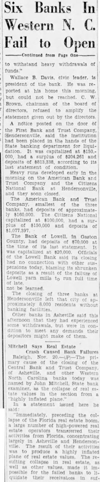 Purely Local Situation Nov The primary the closing of the Central and Carolina today named by John Mitchell, examiner the collapse real estate in the section inflated In the statement issued here he department feels that should the he Bank and Trust com "Immediately preceding the the Florida real large number of high-powered real estate their tivities from Florida largely Asheville HendersonThe result of their activities highly inflated plane of estate values "The collapse in real estate well values made possible the banks to date in sufficient ume demands of depositers "This situation purely does way reflect one conditions in the state generally should no ing the solvency other within the of September the call report of Carolina banks held cash reserve five million dollars and second ary reserve consisting of marketable securities in the amount thirty five dollars. is illus trative of the strength of the state's institutions Without Banks The closing of the three Hendersonville left that city ap proximately 000 residents without banking Banks Strong Other Asheville said they had dition demands depositors notice the Bank and the institution been placed the state department for dation was capitalized $150 surplus $204,261 deposits 628 according its last statement condition Heavy runs early in the morning on the American and Trust company and the Citizens tional bank Hendersonville and they closed American Bank and Trust smallest the three banks had deposits the Citizens National capitalized at had surplus and deposits $1,077,397 The Bank Biltmore Oteen was capitalized $50,000 $25,000 profits and its office Biltmore and Branch The of Lowell in had deposits of $70,000 the time was capitalized the Lowell bank said Its closing had no with shrunken deposits result fail yarn mills to run full time of late.