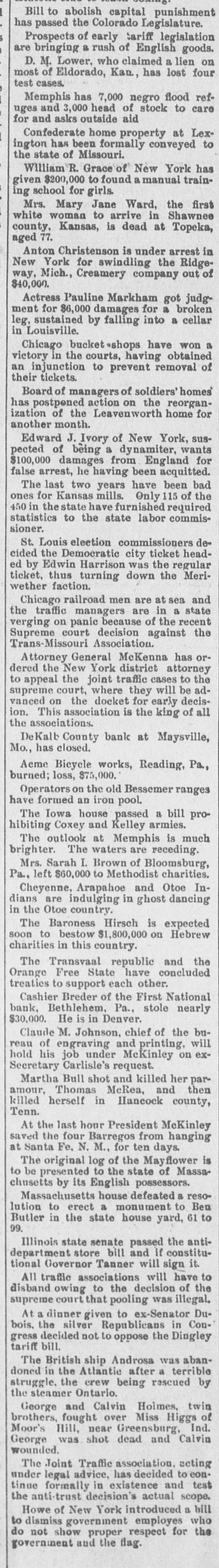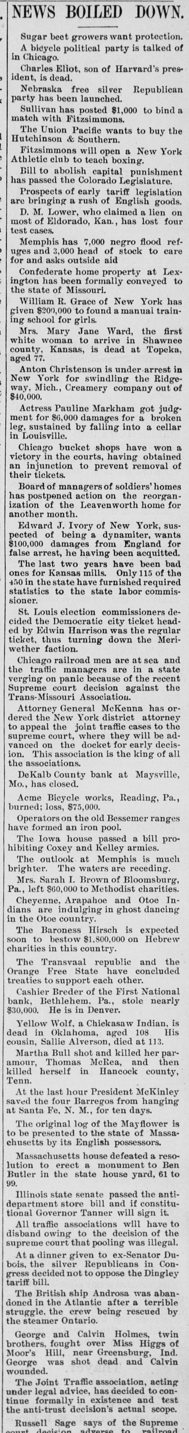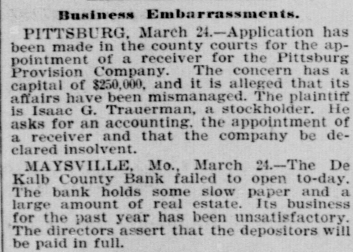 GOLDBUG GOOD TIMES. How Restored Confidence Works in the Business Community. The Louisville, (Ky.) Chair company has assigned with $60,000 liabilities and assets much larger. The Phoenix Lumber Company, of Houston, Texas, has made an assignment. Martin, Wise & Fitzhugh, cotton buyers at Paris, Texas, have made an assignment. The DeKalb County bank, of Maysville, Mo., is in the hands of the state bank examiner. Judgment for $6,200 has been taken against Luke D. Ralph, dealer in clothing, at Ogdensburg, N. Y. He has been in business thirty years. The estimated liabilities of Martin, Wise & Fitzhugh, cotton buyers, who failed last Monday at Paris, Tex., is $800,000, largely in Liverpool. A deed of trust covering the clothing store of O. O. Connor, Paris, Texas, amounting to $32,100, has been filed. Monaghan, general store at S. C., has been Sumpter, R. P. closed He by has the sheriff on judgments for $4,048. been in business many years. The Farmers' and Mechanics' Bank, of Paris, Tex., has nade an assignment. A bill for a receiver for the Christopher Columbus Building and Loan Association was filed in Chicago on Monday, by the president of the association. S. M. Young & Son., grocers at New Castle, Pa., have made an assignment. The J. R. Dayton Tablet Company, of Quincy, Ill., has asked an extension. Breeden, Talley & Co., dealers in dry goods at Richmond, Va., have made an assignment. The property and plant of the New Orleans Sewerage Company has been sold under receivership proceedings to N. W. Jordan, representing the American Loan and Trust Company, of Boston, Mass., for $83,000. A statement by the assignees of the suspended Commercial Bank. at Seima, Ala., places the liabilities at $1,000,000; assets, $52,266; subject to a reduction of $25,000 deposited during the three days The prior to the closing of the bank. books show deposits to be $174,000, almost double the amount heretofore estimated. The depositors will not realize over 20 per cent. Martin, Wise & Fitzhugh, cotton buyoffices at New Orleans, GalvesDallas, New ton, ers, with Houston, York, Liver- deeds pool and Havre, made individual of trust at Paris, Tex., Monday afternoon, this being the firm's headquarters; preferred creditors, $90,000; liabilities, $1,000,000. No official statement yet made. The Surety Building and Loan Assowhose stockholders are well of the ciation, known residents northwestern made portion of Philadelphia, has an assignment for the benefit of creditors. The firm of Knowles & Poole. shoe manufacturers, of Pittsfield, N. H., who informed their employes that business would be suspended if Bryan was elected, made an assignment for the benefit of creditors on the 16th instant for $75,000. Ex-Governor Tuttle, manufacturer of custom clothing, of Pittsfield, N. H., made his first reduction in wages during a career of thirty years of 25 per cent since a cut business down election. by Anna R. Hefferman, engaged in the millinery business at 926 Ninth street, F. has made an assignment to Rosa Downing, placing the liabilities at $1,485.96 and assets at $557.33. Adams, Jewett & Co., paper bag manufacturers at 29 to 33 Academy street, Cleveland, Ohio, has filed chattel and real estate mortgages in the recorder's office for about $130,000. The doors of the American Exchange Bank, of Buffalo, N. Y., were closed Saturday for the last time. A circular was sent to the bank depositors, in which it was announced that the directors of the bank had decided to liquidate its affairs. At a mass meeting of miners in PMillipsburg, Pa., Sunday, resolutions were adopted, declaring against any acceptance of a reduction in the mining rate, and calling upon the men who have accepted a reduction to quit work. Joseph H. Brooke, engaged at 937 Louisiana avenue in the paint business, has made an assignment for the benefit of his creditors.