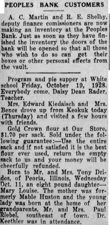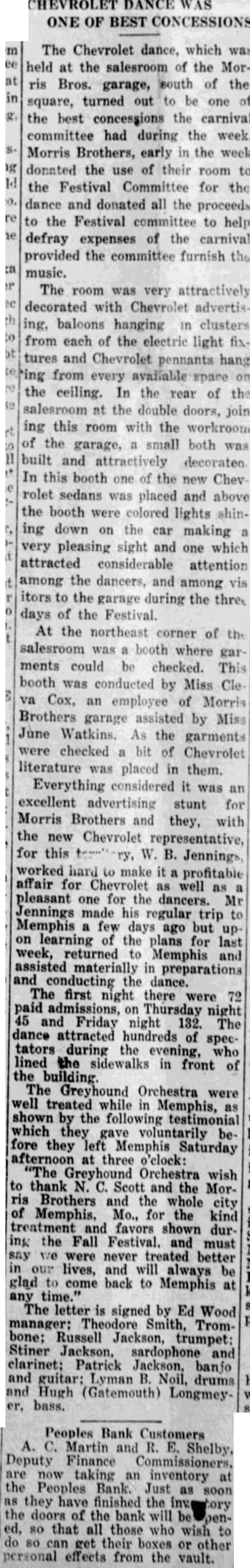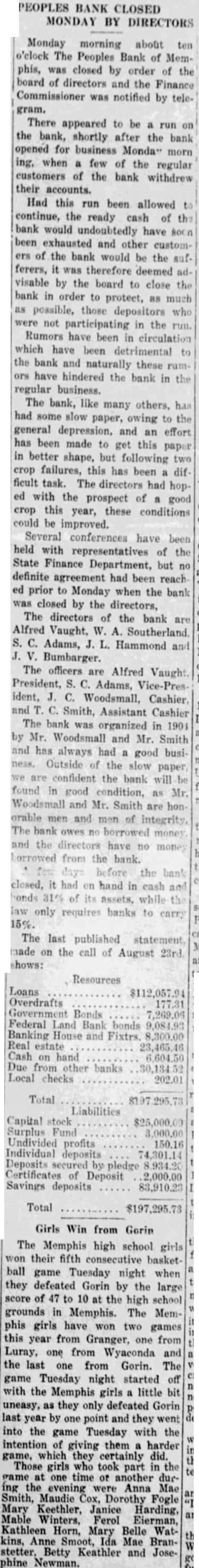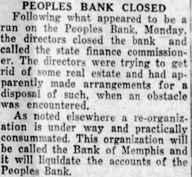 MOVEMENT MADE TO ORGANIZE NEW BANK The directors of the Peoples Bank, which was closed Monday morning after run was started the bank, met the bank day evening in conference with Selby, of Maryville, Mo., uty fiance commissioner, to what, if anything can be done, ward re-organization to protect the depositors of the bank. After some discussion, and formation given the directors Selby, decided to make attempt to organize new bank to act the liquidating agent of the Peoples Bank. In this way tremendous expense will be saved the depositors. It costs money and lots of it for the Finance partment to liquidate bank, whereas new bank be can ganized can liquidate the bank with very little expense. The directors of the Peoples Bank have shown their good faith and interest in satisfactory liquidation of that bank by stock in the bank, and the depositors use able amount and disregard some the street rumors which are always afloat after bank closes, believe their own interests assist all concerned satisfactory adjustment of an unfortunate affair. proposed to call the bank the "Bank of Memphis.". directors and officers will be elected by the share holders. The new bank will start with clean slate. There will slow notes or real loans estate its hands. The plan to sell 250 shares value of $100. The shares being for at $120. to capital stock surplus. In this way proposed to open the new bank capital of $25,000 and Much of this stock was vesterday. now looks balance will be subscribed few days, and the will new bank probably open for business shortly. Martin and Mr. Deputy Finance Commissioners making an inventory the Peoples Bank. and that finished those have personal effects at the bank call and them. may get The directors the Peoples Bank met night again with Shelby. During the day 200 shares stock the new bank had been subscribed. leaving than 50 shares be sold there seems to be doubt no present but that the new bank will ready to in few days