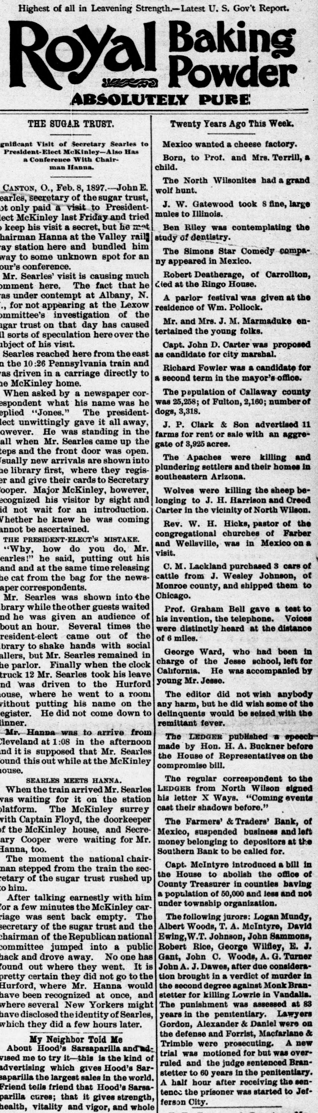 Highest of all in Leavening Strength.-Latest U. S. Gov't Report. Baking Powder Royal ABSOLUTELY PURE THE SUGAR TRUST. Twenty Years Ago This Week. gnifleant Visit of Secretary Searles to Mexico wanted a cheese factory. President-Elect McKinley-Also Has Born, to Prof. and Mrs. Terrill, a a Conference With Chairman Hanna. child. The North Wilsonites had a grand CANTON, O., Feb. 8, 1897.-John E. wolf hunt. earles, secretary of the sugar trust, J. W. Gatewood took 8 fine, large only paid a visit to Presidentmules to Illinois. McKinley last Friday and tried Ben Riley was contemplating the keep his visit a secret, but he met hairman Hanna at the Valley rail] study of dentistry. station here and bundled him The Simons Star Comedy compato some unknown spot for an ny appeared in Mexico. conference. Robert Deatherage, of Carrollton, Mr. Searles' visit is causing much died at the Ringo House. omment here. The fact that he under contempt at Albany, N. A parlor festival was given at the for not appearing at the Lexow residence of Wm. Pollock. ommittee's investigation of the Mr. and Mrs. J. M. Marmaduke entrust on that day has caused tertained the young folks. sorts of speculation here over the ibject of his visit. Capt. John D. Carter was proposed Searles reached here from the east as candidate for city marshal. the 10:26 Pennsylvania train and Richard Fowler was a candidate for driven in a carriage directly to a second term in the mayor's office. McKinley home. The pepulation of Callaway county When asked by a newspaper corwas 25,258; of Fulton, 2,160; number of espondent what his name was he dogs, 3,318. eplied "Jones." The presidentunwittingly gave it all away, J. P. Clark & Son advertised 11 owever. He was standing in the farms for rent or sale with an aggreall when Mr. Searles came up the gate of 3,925 acres. teps and the front door was open. The Apaches were killing and sually new arrivals are shown into plundering settlers and their homes in library first, where they regissoutheastern Arizona. and give their cards to Secretary ooper. Major McKinley, however, Wolves were killing the sheep beecognized his visitor by sight and longing to J. H. Harrison and Creed not wait for an introduction. Carter in the vicinity of North Wilson. Vhether he knew he was coming Rev. W. H. Hicks, pastor of the annot be ascertained. congregational churches of Farber THE PRESIDENT-ELEOT'S MISTAKE. and Wellsville, was in Mexico on a "Why, how do you do, Mr. visit. earles!" he said, putting out his C. M. Lackland purchased 3 cars of and and at the same time releasing cattle from J. Wesley Johnson, of cat from the bag for the newsMonroe county, and shipped them to aper correspondents. Chicago. Mr. Searles was shown into the brary while theother guests waited Prof. Graham Bell gave a test to he was given an audience of his invention, the telephone. Voices bout an hour. Several times the were distinctly heard at the distance resident-elect came out of the of 6 miles. brary to shake hands with social George Ward, who had been in allers, but Mr. Searles remained in charge of the Jesse school, left for parlor. Finally when the clock California. He was accompanied by truck 12 Mr. Searles took his leave young Mr. Jesse. was driven to the Hurford The editor did not wish anybody louse, where he went to a room any harm, but he did wish some of the vithout putting his name on the delinquents would be seized with the egister. He did not come down to linner. remittant fever. Mr. Hanna was to arrive from The LEDGER published a speech Cleveland at 1:08 in the afternoon made by Hon. H. A. Buckner before it is supposed that Mr. Searles the House of Representatives on the ound this out while at the McKinley compromise bill. iouse. The regular correspondent to the SEARLES MEETS HANNA. LEDGER from North Wilson signed When the train arrived Mr. Searles his letter X Ways. "Coming events waiting for it on the station cast their shadows before." latform. The McKinley surrey with Captain Floyd, the doorkeeper The Farmers' & Traders' Bank, of the McKinley house, and SecreMexico, suspended business and left Cooper were waiting for Mr. money belonging to depositors at the Hanna, too. Southern Bank to be called for. The moment the national chairCapt. McIntyre introduced a bill in stepped from the train the secthe House to abolish the office of retary of the sugar trust rushed up County Treasurer in counties having him. a population of 50,000 and less and not After talking earnestly with him under township organization. a few minutes the McKinley carThe following jurors: Logan Mundy, riage was sent back empty. The Albert Woods, T. A. McIntyre, David secretary of the sugar trust and the chairman of the Republican national Ewing, W.T. Johnson, John Sammons, Robert Rice, George Wilfley, E. J. committee jumped into a public Gant, John C. Woods, A. G. Turner hack and drove away. No one has John A. J. Dawes, after due considerafound out where they went. It is tion brought in a verdict of murder in pretty certain they did not go to the the second degree against Monk BranHurford, where Mr. Hanna would stetter for killing Lowrie in Vandalia. have been recognized at once, and The punishment was assessed at 83 where several New Yorkers might years in the penitentiary. Lawyers have disclosed the identity of Searles, Gordon, Alexander & Daniel were on which they did a few hours later. the defense and Forrist, Macfarlane & My Neighbor Told Me Trimble were prosecuting. A new About Hood's Sarsaparilla and'adtrial was motioned for but was overvised me to try it-this is the kind of ruled and the judge sentenced Branadvertising which gives Hood's Sarstetter to 60 years in the penitentiary. saparilla the largest sales in the world. A half hour after receiving the senFriend teils friend that Hood's Sarsatence the prisoner was started to Jefparilla cures; that it gives strength, ferson City. health. vitality and vigor. and whole