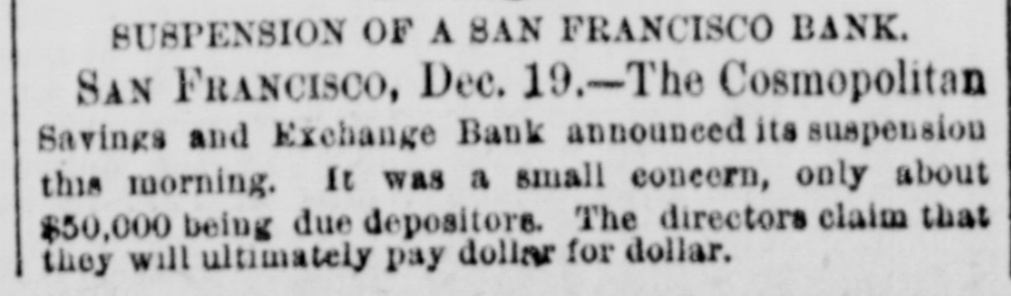 SUSPENSION OF A SAN FRANCISCO BANK. SAN FRANCISCO, Dec. 19.-The Cosmopolitan Savings and Exchange Bank announced its suspension this morning. It was a small concern, only about $50,000 being due depositors. The directors claim that they will ultimately pay dollar for dollar.