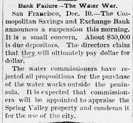 Bank Failure-The Water War. San Francisco, Dec. I0.-The Cosmopolitan Savings and Exchange Bank announces a suspension this morning. It is a small concern. About $50,000 is due depositors. The directors claim that they will ultimately pay dollar for dollar. The water commissioners have rejected all propositions for the purchase of the water works outside the peninsula. It is expected that commissioners will be appointed to appraise the Spring Valley property and condemn it for the use of the city.