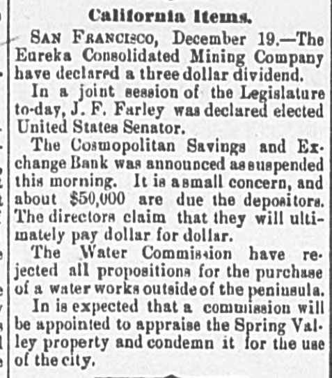 California Items. SAN FRANCISCO, December 19.-The Eureka Consolidated Mining Company have declared a three dollar dividend. In a joint session of the Legislature to-day, J. F. Farley was declared elected United States Senator. The Cosmopolitan Savings and Ex. change Bank was announced assuspended this morning. It is small concern, and about $50,000 are due the depositors. The directors claim that they will ultimately pay dollar for dollar. The Water Commission have re. jected all propositions for the purchase of a water works outside of the peninsula. In is expected that a commission will be appointed to appraise the Spring Val. ley property and condemn it for the use of the city.