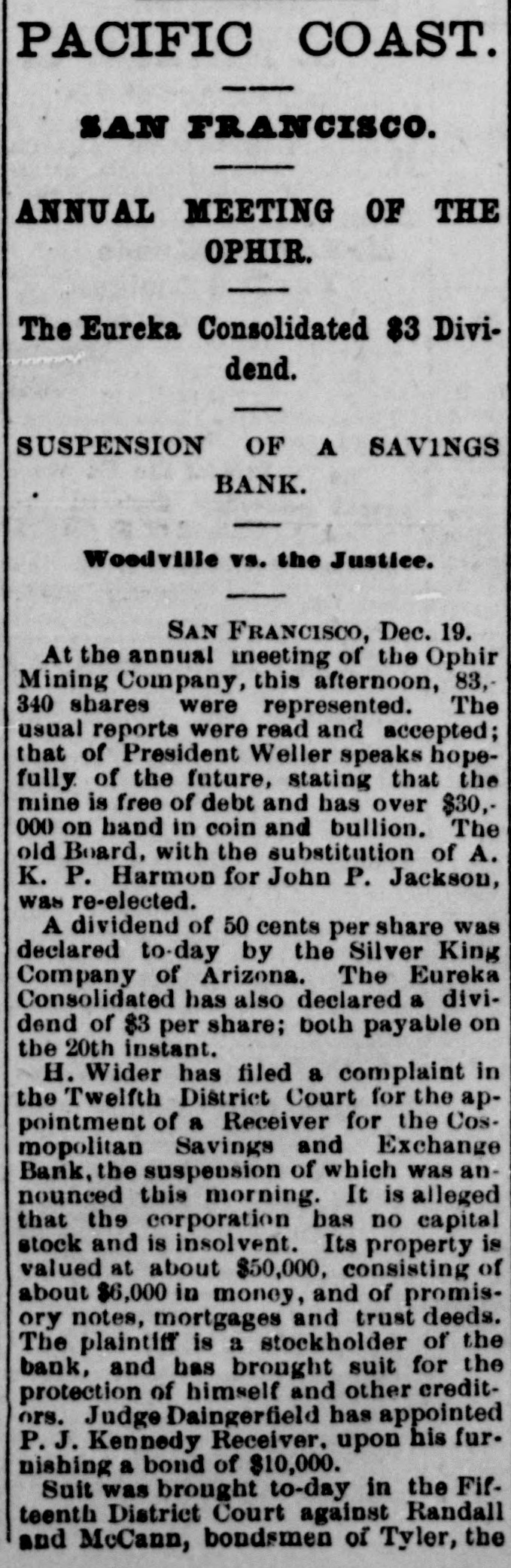 PACIFIC COAST. SAN FRANCISCO. ANNUAL MEETING OF THE OPHIR. The Eureka Consolidated $3 Dividend. SUSPENSION OF A SAVINGS BANK. Woodville vs. the Justice. SAN FRANCISCO, Dec. 19. At the annual meeting of the Ophir Mining Company, this afternoon, 83, 340 shares were represented. The usual reports were read and accepted; that of President Weller speaks hopefully of the future, stating that the mine is free of debt and has over $30,000 on hand in coin and bullion. The old Board, with the substitution of A. K. P. Harmon for John P. Jackson, was re-elected. A dividend of 50 cents per share was declared to-day by the Silver King Company of Arizona. The Eureka Consolidated has also declared a dividend of $3 per share; both payable on the 20th instant. H. Wider has filed a complaint in the Twelfth District Court for the appointment of a Receiver for the Cosmopolitan Savings and Exchange Bank, the suspension of which was announced this morning. It is alleged that the corporation bas no capital stock and is insolvent. Its property is valued at about $50,000, consisting of about $6,000 in money, and of promisory notes, mortgages and trust deeds. The plaintiff is a stockholder of the bank, and has brought suit for the protection of himself and other creditors. Judge Daingerfield has appointed P.J. Kennedy Receiver, upon his furnishing a bond of $10,000. Suit was brought to-day in the Fifteenth District Court against Randall and McCann, bondsmen of Tyler, the