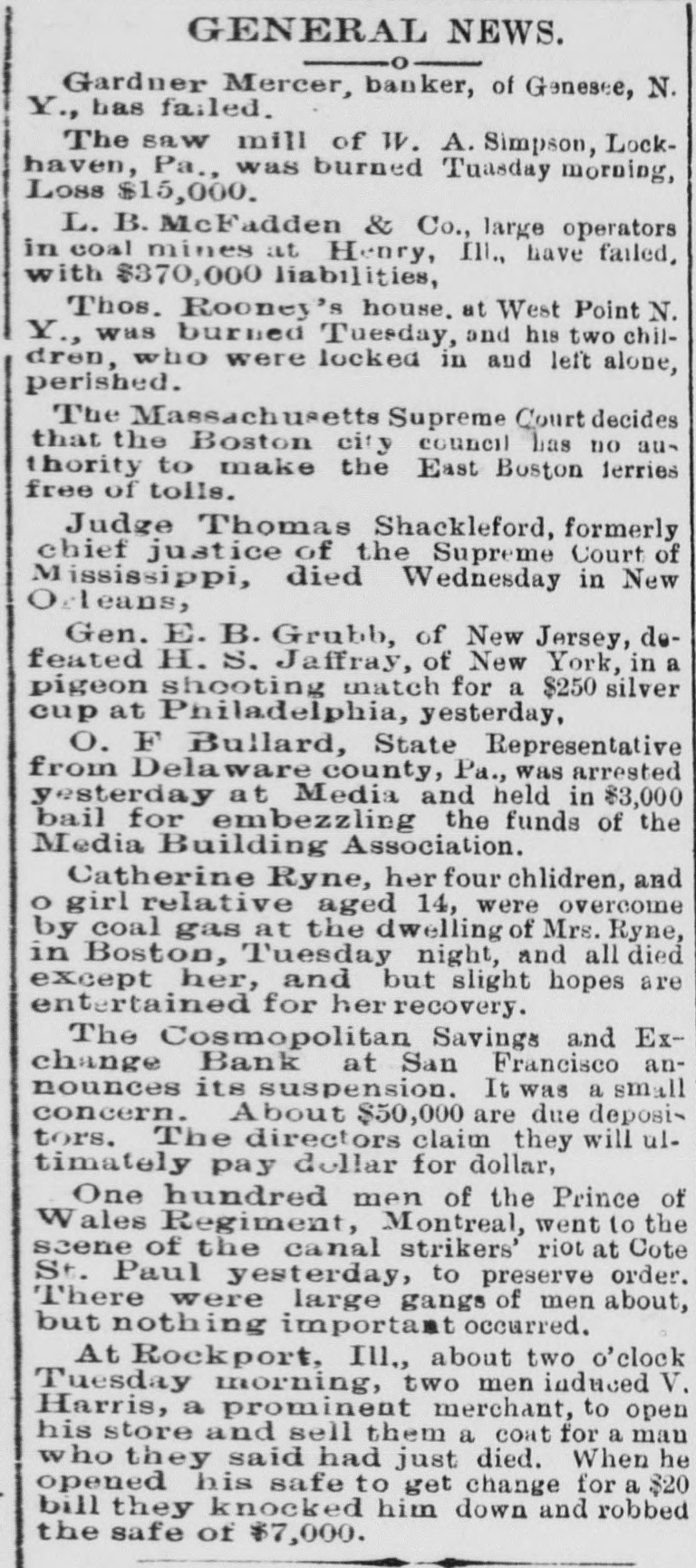 GENERAL NEWS. Gardner Mercer, banker, of Genesee, N. Y., has failed. The saw mill of W. A. Simpson, Lockhaven, Pa., was burned Tuasday morning, Loss $15,000. L. B. McFadden & Co., large operators in coal mines at Henry, III., have failed, with $370,000 liabilities, Thos. Rooney's house. at West Point N. Y., was burned Tueeday, and his two children, who were locked in and left alone, perished. The Massachusetts Supreme Court decides that the Boston city council has no authority to make the East Boston Jerries free of tolls. Judge Thomas Shackleford, formerly chief justice of the Supreme Court of Mississippi, died Wednesday in New Orleans, Gen. E. B. Grubb, of New Jersey, defeated H. S. Jaffray, of New York, in a pigeon shooting match for a $250 silver cup at Philadelphia, yesterday, O. F Bullard, State Representative from Delaware county, Pa., was arrested yesterday at Media and held in $3,000 bail for embezzling the funds of the Media Building Association. Catherine Ryne, her four chlidren, and O girl relative aged 14, were overcome by coal gas at the dwelling of Mrs. Ryne, in Boston, Tuesday night, and all died except her, and but slight hopes are entertained for recovery. The Cosmopolitan Savings and Exchange Bank at San Francisco announces its suspension. It was a small concern. About $50,000 are due deposi> tors. The directors claim they will ultimately pay dollar for dollar, One hundred men of the Prince of Wales Regiment, Montreal, went to the scene of the canal strikers' riot at Cote St. Paul yesterday, to preserve order. There were large gangs of men about, but nothing important occurred. At Rockport, Ill,, about two o'clock Tuesday morning, two men induced V. Harris, a prominent merchant, to open his store and sell them a coat for a man who they said had just died. When he opened his safe to get change for a $20 bill they knocked him down and robbed the safe of $7,000.