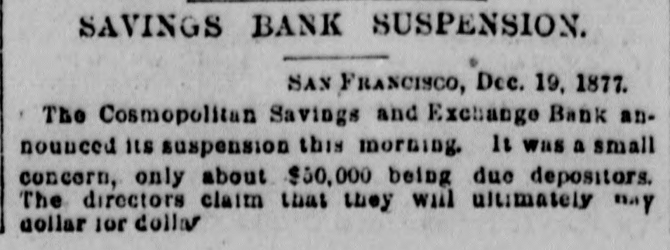 SAVINGS BANK SUSPENSION. SAN FRANCISCO, Dec. 19, 1877. The Cosmopolitan Savings and Exchange Bank announced its suspension this morning. 11 was a small concern, only about $50,000 being due depositors. The directors claim that they will ultimately ""Y dollar for dollar