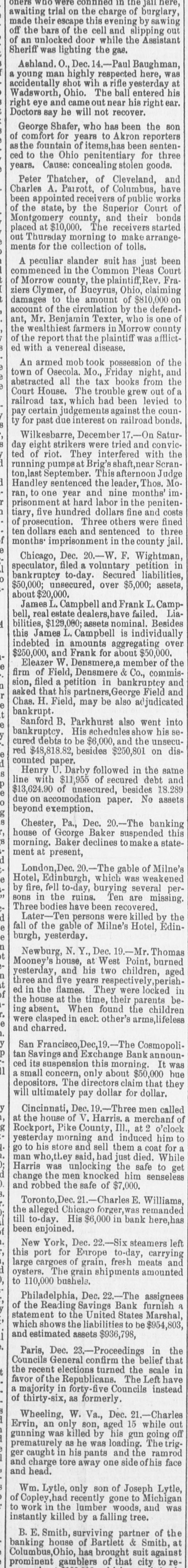 awaiting trial on the charge of burglary, made their escape this evening by sawing off the bars of the cell and slipping of an unlocked door while the Assistant Sheriff was lighting the gas. Ashland. O., Dec. 14.-Paul Baughman, a young man highly respected here, accidentally shot wih rifle yesterday Wadsworth, Ohio. The ball entered right eye and came out near his right Doctors say he will not recover. George Shafer, who has been the of comfort for years to Akron reporters son as the fountain of items,has been sentenced to the Ohio penitentiary for three years. Cause: concealing stolen goods. Peter Thatcher, of Cleveland, Charles A. Parrott, of Columbus, have and been appointed receit of public works of the state, by the Superior Court of Montgomery county, and their bonds placed at $10,000. The receivers started out Thursday morning to make arrangements for the collection of tolls. A peculiar slander suit has just been commenced in the Common Pleas Court of Morrow county, the plaintiff, Fraziers Clymer, of Bucyrus, Ohio, claiming damages to the amount of $810,000 on account of the circulation by the defendant, Mr. Benjamin Texter, who is one of the wealthiest farmers in Morrow county of the report t the plaintiff was afflicted with a venereal disease. An armed mob took possession of town of Osecola, Mo., Friday night, the Court abstracted all the tax books from and the House. The trouble grew out railroad tax, which had been levied to pay certain judgements against the county for past due interest on railroad bonds. Wilkesbarre, December Saturday eight strikers were tried and convicted of riot. They interfered with the running pumpsat Brig's Scranton,last September. This afternoon Handley sentenced the leader, Thos, Mo. ran, to one year and nine months' imprisonment at hard labor in the penitentiary, five hundred dollars fine and costs of prosecution. Three others were fined ten dollars each and sentenced to three months imprisonment in the county Chicago, Dec. 20.-W. F. Wightman, speculator, filed a voluntary petition bankruptcy to-day. Secured liabilities, in $50,000; unsecured, over $5,000; assets, bout $20,000. James] Campbell and Frank L Campbell, real estate dealers,have failed. Liabilities, $129,000; assets nominal. Besides this James L. Campbell is individually indebted in amounts aggregating over $250,000, and Frank for about $50,000. Eleazer W. Densmere,a member of firm of Field, Densmere & Co., commis- the sion, filed a petition in bankruptcy asked that his partners,George Field Chas. bankrupt. H. Field, may be also ad !judicated Sanford B, Parkhurst also went into bankruptcy. His schedules show his se cured debts to be $6,000, and the unsecured $48,818.82, besides $250,801 on dis. counted paper. Henry U. Darby followed in the same line with $11,955 of secured debt $13,624.90 of unsecured, besides due accomodation paper. No 18.289 assets beyond exemption. Chester, Pa., Dec. 20.-The banking house of George Baker suspended morning. Baker declines to make state. this ment at present, London Dec. -The gable of Milne's Hotel, Edinburgh, which was weakened by fire, fell to-day, burying several sons Three in the ruins. Ten are missing. bodies been recovered, Later-Ten persons killed by fall of the gable of Milne's Hotel, Edin- the burgh, yesterday. Newburg, N.Y., Dec. 19.-Mr. Thomas Mooney's house, at West Point, burned yesterday, and his two children, three and five years respectively, perish- aged ed in the flames. They were locked the house at the time, their parents be- in ing absent. When found the children were clasped in each other's arms,lifeless and charred. San Francisco Cosmopolitan Savings and Exchange Bank ced its suspension this morning. It a small concern, only about $50,000 was depositors. will The directors claim that they hue ultimately pay dollar for dollar. Cincinnati, Dec. 19.-Three men called at the house of V. Harris. a merchanf Rockport, Pike County, Ill., at yesterday morning and induced o'clock him go to his store and sell them a coat for to man who, said, had just died. Harris was unlocking the safe While change the men knocked him senseless to and robbed the safe of $7,000. Toronto, Dec. -Charles E. Williams, the alleged Chicago forger,v remanded till to-day. His $6,000 in bank here,has been enjoined. New York, Dec. 22.-Six steamers this port for Enrope to-day, carrying left large cargoes of grain, fresh meats oysters. The grain shipments amounted to 110,000 bushels. of Philadelphia, Dec. 22.-The assignees the Reading Savings Bank furnish statement to the United States Marshal, which shows the liabilities to be $954,803, and estimated assets $936,798, Paris, Dec. 23.-Proceedings in the Councils General confirm the belief the favor recent elections turned the scale of the Republicans. The of majority in forty-five Councils instead thirty-six, as formerly. Wheeling, W. Va., Dec. 21. -Charles Ervin, an only son, aged 15 while gunning was killed by his gun going out prematurely as he was loading. The trig- off ger caught in his pants and the ramrod and charge tore away one side of his and head. Wm. Lytle, only son of Joseph Lytle, of Copley,had recently gone to Michigan to work in the lumber woods, and was instantly killed by a falling tree. B. E. Smith, surviving partner of the banking house of Bartlett & Smith, Columbus Ohio, has brought suit against at prominent gamblers of that city tore-