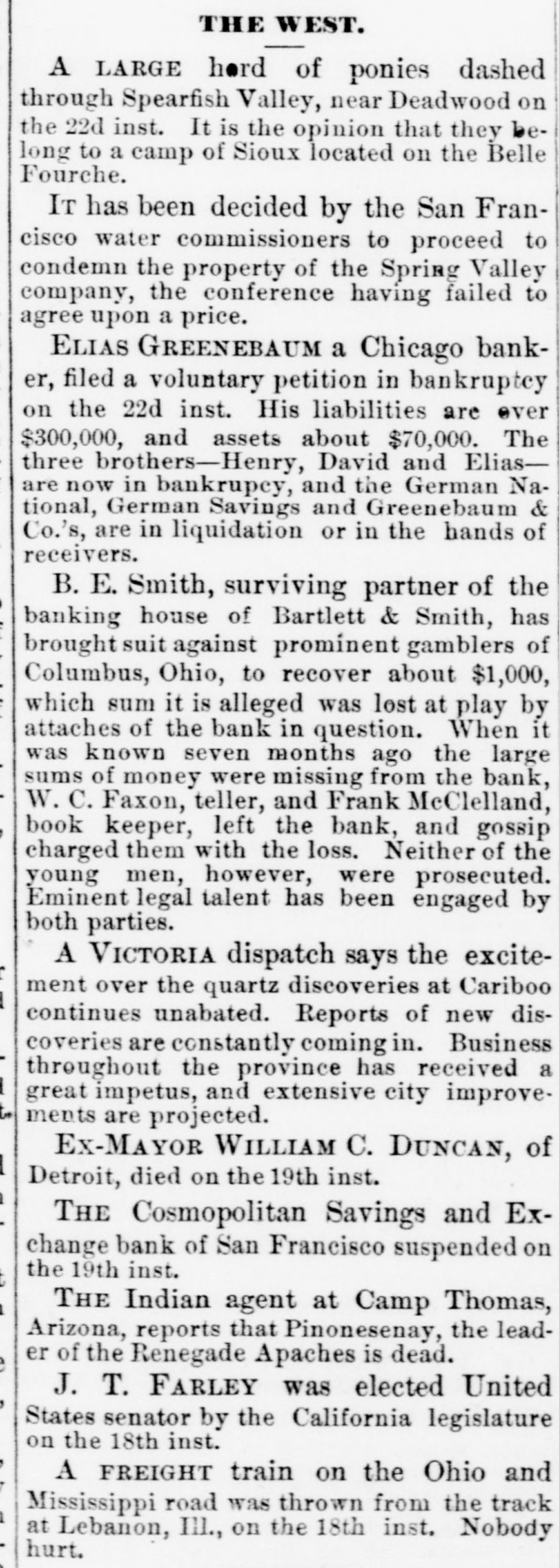 THE WEST. A LARGE hord of ponies dashed through Spearfish Valley, near Deadwood on the 22d inst. It is the opinion that they belong to a camp of Sioux located on the Belle Fourche. IT has been decided by the San Francisco water commissioners to proceed to condemn the property of the Spring Valley company, the conference having failed to agree upon a price. ELIAS GREENEBAUM a Chicago banker, filed a voluntary petition in bankruptcy on the 22d inst. His liabilities are over $300,000, and assets about $70,000. The three brothers-Henry, David and Eliasare now in bankrupey, and the German National, German Savings and Greenebaum & Co.'s, are in liquidation or in the hands of receivers. B. E. Smith, surviving partner of the banking house of Bartlett & Smith, has brought suit against prominent gamblers of Columbus, Ohio, to recover about $1,000, which sum it is alleged was lost at play by attaches of the bank in question. When it was known seven months ago the large sums of money were missing from the bank, W. C. Faxon, teller, and Frank McClelland, book keeper, left the bank, and gossip charged them with the loss. Neither of the young men, however, were prosecuted. Eminent legal talent has been engaged by both parties. A VICTORIA dispatch says the excitement over the quartz discoveries at Cariboo continues unabated. Reports of new discoveries are constantly coming in. Business throughout the province has received a great impetus, and extensive city improvements are projected. Ex-MAYOR WILLIAM C. DUNCAN, of Detroit, died on the 19th inst. THE Cosmopolitan Savings and Exchange bank of San Francisco suspended on the 19th inst. THE Indian agent at Camp Thomas, Arizona, reports that Pinonesenay, the leader of the Renegade Apaches is dead. J. T. FARLEY was elected United States senator by the California legislature on the 18th inst. A FREIGHT train on the Ohio and Mississippi road was thrown from the track at Lebanon, III., on the 18th inst. Nobody hurt.