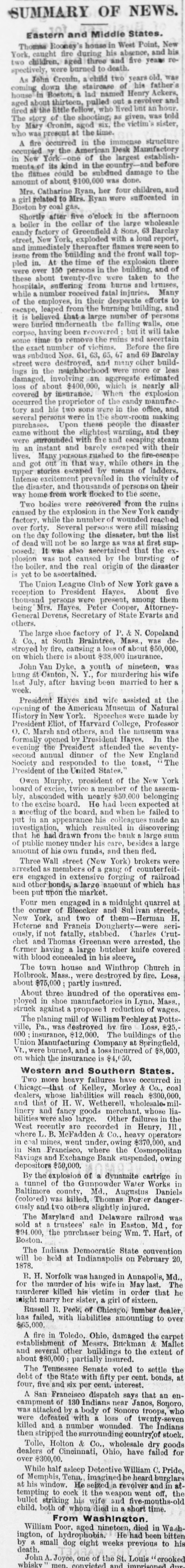 SUMMARY OF NEWS. Eastern and Middle States. Thomas Rooney's house in West Point, New York, caught fire during his absence, and his two children, aged three and five years respectively, were burned to death. As John Cronin, child two years old. was coming down the staircase of his father's house in Boston, à lad named Henry Ackers, aged about thirteen, pulled out a revolver and fired at the little fellow, who lived but an hour, The story of the shooting, as given, was told by Mary Cronin, agod six, the victim sister, who was present at the time. A fire occurred in the immense structure occupied by the American Desk Manufactory in New York -one of the largest establishments of its kind in the country and before the flames could be subdued damage to the amount of about $100,000 was done. Mrs. Catharine Ryan, her four children, and R girl related to Mrs. Ryan were suffocated in Boston by coal gas. Shortly after five o'elock in the afternoon a boiler in the cellar of the large wholesale candy factory of Greenfield & Sons, 63 Barclay street, New York, exploded with lond report, and immediately thereafter flames were seen to issue from the building and the front wall toppled in. At the time of the explosion there were over 150 persons in the building, and of these about twenty were taken to the hospitals, suffering from hurns and bruises, while number received fatal injuries. Many of the employes, in their desperate efforts to escape, leaped from the burning building, and it is believed that a large number of persons were buried underneath the falling walls, one corpse, having been recovered but it will take some time to remove the ruins and ascertain the exact number of victims. Before the fire was subdued Nos. 61, 63, 65. 67 and 69 Barclay street were destroyed, and many other buildings in the neighborhood were more or less damaged, involving an aggregate estimated loss of about $400 000, which is nearly all covered by insurance. When the explosion occurred the proprietor of the candy manufactory and his two sons were in the office, and several persons were in the show-room making purchases. Upon these people the disaster came without the slightest warning, and they were surrounded with fire and escaping steam in an instant and barely escaped with their lives. Many persons rushed to the fire-escape and got out in that way, while others in the upper stories escaped by means of ladders. Intense excitement prevailed in the vicinity of the disaster, and thousands of persons on their way home from work flocked to the scene. Two bodies were recovered from the ruins caused by the explosion in the New York candy factory. while the number of wounded reached over forty. Several persons were still missing on the day following the disaster, but the list of dead will not be 80 large as was at first supposed. It was also ascertained that the explosion was not caused by the bursting of the boiler. and the real origin of the disaster is yet to be ascertained. The Union League Club of New York gave reception to President Hayes. About five thousand persons were present, among them being Mrs. Hayes. Peter Cooper, AttorneyGeneral Devens, Secretary of State Evarts and others. The large shoe factory of P. & N. Copeland & Co., at South Braintree, Mass. was destroyed by fire, causing a loss of about $50,000, on which there is about $38 000 insurance. John Van Dyke, a youth of nineteen, was hung at Canton, N. Y., for murdering his wife last July, after having been married to her & week. President Haves and wife assisted at the opening of the American Museum of Natural History in New York Speeches were made by President Eliot, of Harvard College, Professor O. C. Marsh and others, and the museum was formally opened by President Haves. In the evening the President attended the seventysecond annual dinner of the New England Society and responded to the toast, The President of the United States.' Owen Murphy, president of the New York board of excise, twice member of the assembly, absconded with nearly $50,000 belonging to the excise board. He had been expected at a meeting of the board. and when he failed to put in an appearance his colleagues made an investigation, which resulted in discovering that he had drawn from the bank a large sum of public money under his care, besides large amount of his own funds, and then fled. Three Wall street (New York) brokers were arrested as members of a gang of counterfeit ers engaged in extensive forging of railroad and other bonds, large amount of which has been put upon the market. Four men engaged in a midnight quarrel at the corner of Bleecker and Sul ivan streets, New York. and two of them-Herman H. Heterne and Francis Dougherty-were seriously, if not fatally. stabbed. Charles Crutchet and Thomas Greenan were arrested, the former having large butcher knife covered with blood concealed in his sleeve, The town house and Winthrop Church in Holbrook. Mass., were destroyed by fire. Loss, about $75,000; partly insured. About three hundred of the operatives employed in shoe manufactories in Lynn. Mass. struck against a propose reduction of wages. The planing mill of William Pechley at Pottsville, Pa., was destroyed by fire Loss, $25, 000 insurance, $12,000. The buildings of the Union Manufacturing Company at Springfield, Vt., were burned. and a lossincurred of $8,000, on which the insurance is $4,050. Western and Southern States. Two more heavy failures have occurred in Chicago of Kelley, Morley & Co., coal dealers, whose liabilities will reach $300,000, and that of H. W. Wetherell, wholesale-millinery and fancy goods merchant. whose liabilities were also large. Other failures in the West recently are recorded in Henry, III. where L. B. McFadden & Co., heavy operators in coal mines, went under, owing $370,000. and in San Francisco, where the Cosmopolitan Savings and Exchange Bank suspended, owing depositors $50,000. By the explosion of a dynamite cartrige in a tunnel of the Gunpowder W