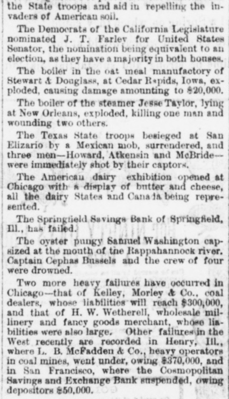 the State troops and aid in repelling the invaders of American soil. The Democrats of the California Legislature nominated J. T. Farlev for United States Senator, the nomination being equivalent to an election, as they have a majority in both houses. The boiler in the oat meal manufactory of Stewart & Douglass, at Cedar Rapids, Iowa, exploded, causing damage amounting to $20,000. The boiler of the steamer Jesse Taylor, lying at New Orleans, exploded. killing one man and wounding two others. The Texas State troops besieged at San Elizario by a Mexican mob, surrendered, and three men-Howard, Atkensin and McBride-were immediately shot by their captors. The American dairy exhibition opened at Chicago with A display of butter and cheese, all the dairy States and Cana is being represented. The Springfield Savings Bank of Springfield, Ill., has failed. The oyster pungy Sanruel Washington capsized at the mouth of the Rappahannock river. Captain Cephas Bussels and the crew of four were drowned. Two more heavy failures have occurred in Chicago-that of Kelley, Morley & Co., coal dealers, whose liabilities will reach $300,000, and that of H. W. Wetherell, wholesale millinery and fancy goods merchant, whose liabilities were also large. Other failuressin the West recently are recorded in Henry, III., where L. B. McFadden & Co., heavy operators in coal mines, went under, owing $370,000, and in San Francisco, where the Cosmopolitan Savings and Exchange Bank suspended, owing depositors $50,000.