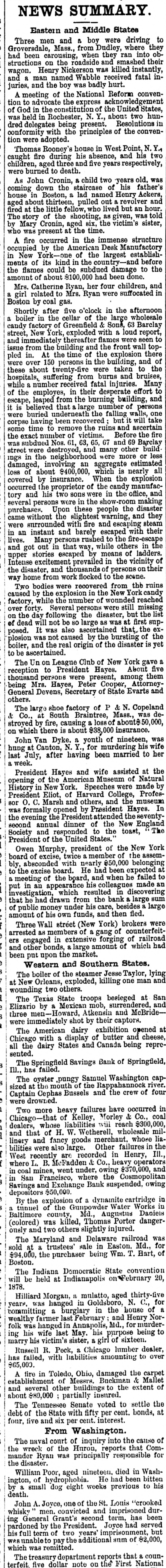 tion to advocate the express acknowledgement of God in the constitution of the United States, was held in Rochester, N. Y., about two hundred delegates being present. Resolutions in conformity with the principles of the convention were adopted. Thomas Rooney's house in West Point, N. Y., caught fire during his absence, and his two children, aged three and five years respectively, were burned to death. As John Cronin, & child two years old. was coming down the staircase of his father's house in Boston, a lad named Henry Ackers, aged about thirteen, pulled out revolver and fired at the little fellow, who lived but an hour. The story of the shooting, as given, was told by Mary Cronin, aged six, the victim's sister, who was present at the time. A fire occurred in the immense structure occupied by the American Desk Manufactory in New York-one of the largest establishments of its kind in the country-and before the flames could be subdued damage to the amount of about $100,000 had been done. Mrs. Catherine Ryan, her four children, and a girl related to Mrs. Ryan were suffocated in Boston by coal gas. Shortly after five o'clock in the afternoon a boiler in the cellar of the large wholesale candy factory of Greenfield & Sons, 63 Barclay street, New York, exploded with a loud report, and immediately thereafter flames were seen to issue from the building and the front wall toppled in. At the time of the explosion there were over 150 persons in the building, and of these about twenty-five were taken to the hospitals, suffering from burns and bruises, while a number received fatal injuries. Many of the employes, in their desperate effort to escape, leaped from the burning building, and it is believed that large number of persons were buried underneath the falling walls, one corpse having been recovered but it will take some time to remove the ruins and ascertain the exact number of victims. Before the fire was subdued Nos. 61, 63, 65, 67 and 69 Barclay street were destroyed, and many other build ings in the neighborhood were more or less damaged, involving an aggregate estimated loss of about $400,000, which is nearly all covered by insurance. When the explosion occurred the proprietor of the candy manufactory and his two sons were in the office, and several persons were in the show-room making purchases. Upon these people the disaster came without the slightest warning, and they were surrounded with fire and escaping steam in an instant and barely escaped with their lives. Many persons rushed to the fire-escape and got out in that way, while others in the upper stories escaped by means of ladders. Intense excitement prevailed in the vicinity of the disaster, and thousands of persons on their way home from work flocked to the scene. Two bodies were recovered from the ruins caused by the explosion in the New York candy factory, while the number of wounded reached over forty. Several persons were still missing on the day following the disaster, but the list of dead will not be 80 large as was at first supposed. It was also ascertained that, the explosion was not caused by the bursting of the boiler, and the real origin of the disaster is yet to be ascertained. The Un on League Club of New York gave a reception to President Hayes. About five thousand persons were present, among them being Mrs. Hayes, Peter Cooper, AttorneyGeneral Devens, Secretary of State Evarts and others. The large shoe factory of P & N. Copeland & Co., at South Braintree, Mass., was destroyed by fire, causing loss of about$ 50,000, on which there is about $38,000 insurance. John Van Dyke. a youth of nineteen, was hung at Canton, N. Y., for murdering his wife last July, after having been married to her a week. President Hayes and wife assisted at the opening of the American Museum of Natural History in New York. Speeches were made by President Eliot, of Harvard College, Professor O. C. Marsh and others, and the museum was formally opened by President Hayes. In the evening the President attended the seventysecond annual dinner of the New England Society and responded to the toast, The President of the United States. Owen Murphy, president of the New York board of excise, twice member of the assembly, absconded with nearly $50,000 belonging to the excise board. He had been expected at a meeting of the board, and when he failed to put in an appearance his colleagues made an investigation, which resulted in discovering that he had drawn from the bank large sum of public money under his care, besides large amount of his own funds, and then fled. Three Wall street (New York) brokers were arrested as members of a gang of counterfeiters engaged in extensive forging of railroad and other bonds, a large amount of which had been put upon the market. Western and Southern States. The boiler of the steamer Jesse Taylor, lying at New Orleans, exploded, killing one man and wounding two others. The Texas State troops besieged at San Elizario by a Mexican mob, surrendered, and three Howard, Atkensin and McBridewere immediately shot by their captors. The American dairy exhibition opened at Chicago with a display of butter and cheese, all the dairy States and Canada being represented. The Springfield Savings Bank of Springfield, III., has failed. The oyster pungy Samuel Washington capsized at the mouth of the Rappahannock river. Captain Cephas Bussels and the crew of four were drowned. Two more heavy failures have occurred in Chicago-that of Kelley, Morley & Co., coal dealers, whose liabilities will reach $300,000, and that of H. W. Wetherell, wholesale millinery and fancy goods merchant. whose liabilities were also large. Other failures in the West recently are recorded in Henry, III., where L. B. McFadden & Co., heavy operators in coal mines, went under, owing $370,000, and in San Francisco, where the Cosmopolitan Savings and Exchange Bank suspended, owing depositors $50,000. By the explosion of a dynamite cartridge in a tunnel of the Gunpowder Water 