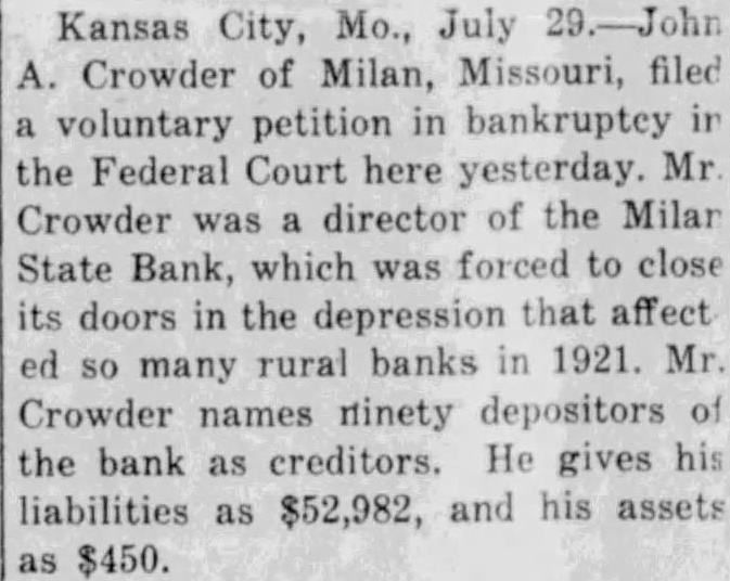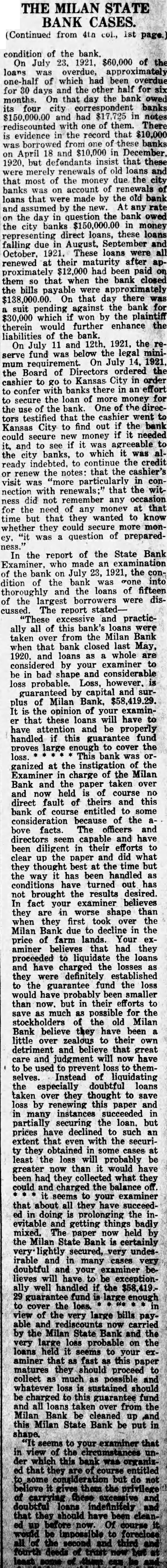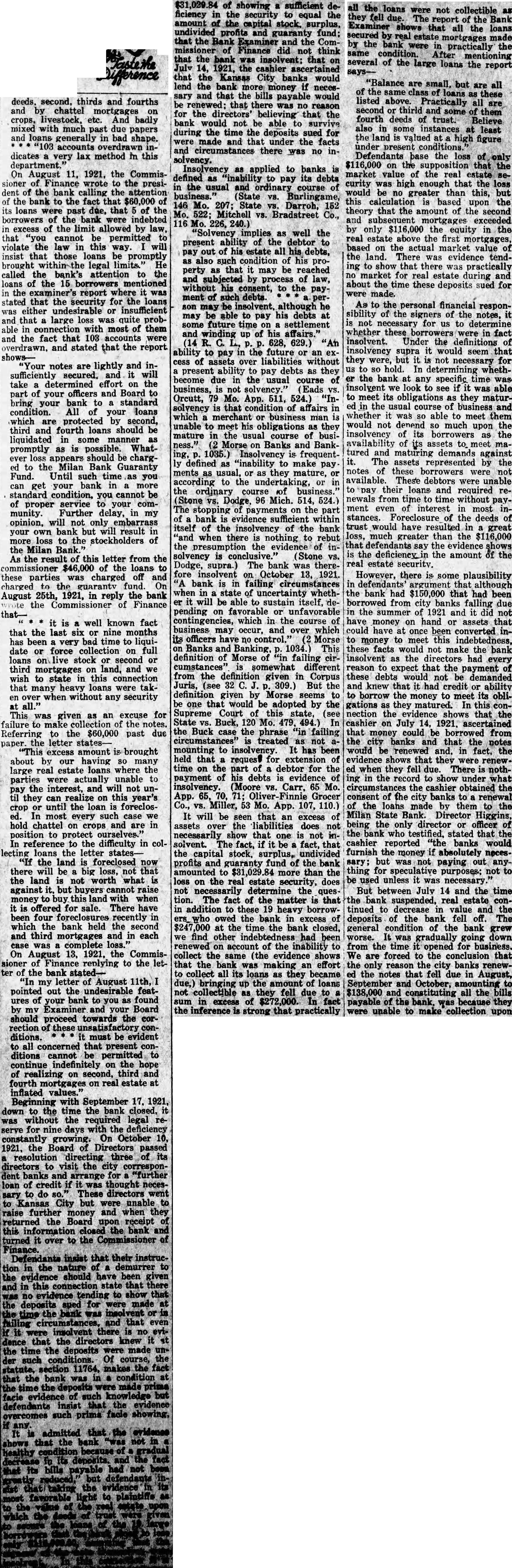 deeds, second, thirds and fourths and by chattel mortgages crops, livestock, etc. And badly mixed with much past due papers and loans generally in bad shape. accounts overdrawn dicates very lax method in this department. On August 11, 1921, the Commisof Finance wrote the president the bank calling the attention the bank to the fact that loans were past due, that of borrowers of the bank were indebted excess of the limit allowed by law, that "you cannot be permitted violate the law in this way. insist that those loans be promptly brought legal limits." He called the bank's attention to the loans of the 15 borrowers the report where was stated that the security for the loans either undesirable or insufficient and that large loss was quite probin connection with most of them and the fact that 103 accounts were overdrawn, and stated that the report "Your notes are lightly and insufficiently secured. and it will take determined effort on the part of your officers and Board bring your bank to standard condition. All of your loans which protected by second, third and fourth loans should be liquidated in some manner promptly as is possible. Whatever loss appears should be chargto the Milan Bank Guaranty Fund. Until such time as you can get your bank in more standard condition, you cannot be of proper service to your community. Further delay, in my opinion, will not only embarrass your own bank but will result more loss to the stockholders of the Milan Bank." As the result of this letter from the commissioner $46,000 of the loans these parties was charged off charged to the guaranty fund. On August 25th, 1921, in reply the bank the of Finance it is well known fact that the last six or nine months has been very bad time to liquidate or force collection on full loans stock or second or third mortgages on land, and wish to state in this connection that many heavy loans were takover when without any security This was given as an excuse for failure to make collection of the notes. Referring to the $60,000 past due letter "This excess amount is brought about by our having so many large real estate loans where the parties were unable the interest, and will not unthey can realize on this year's crop or until the loan is foreclosIn most every such case we hold chattel on crops and are in position to protect ourselves. reference to the difficulty in col lecting loans the letter statesthe land foreclosed now there will be big loss, not that land is not worth what is against it. but buyers cannot raise money to buy this land with when it offered for sale. There have been four foreclosures recently in which bank held the second and third mortgages and in each case was complete On August 13, 1921, the Commissioner of Finance replying to the ter of the bank my letter of August pointed out the undesirable features of your bank you as found by mv Examiner and your Board proceed towards the correction these ditions. must be evident all concerned that present ditions cannot permitted continue indefinitely on the hope of realizing on second, third and fourth mortgages on real estate inflated values." Beginning with September 17. 1921, down to the time the bank closed. was without the required legal reserve for nine days the deficiency constantly growing. On October 10. 1921, the Board of Directors passed resolution three its to visit the city dent banks and arrange for "further loan of credit thought necesto do These directors went Kansas City but were unable raise further money and when they returned the Board upon receipt this information closed the bank and turned it over to the Commissioner Finance. Defendants insist that their instruction the nature demurrer to the should have been given and in this connection state that no evidence tending to show that the deposits sued for were made the bank was and that were there is dence that the directors knew time the deposits made such Of course, statute, section 11764, the bank time facie such insist that the evidence such prima admitted that shows of showing sufficient ficiency the security to equal the amount capital surplus, undivided profits and guaranty fund; that the Bank Examiner and the Commissioner Finance did not think that the bank was insolvent: that on 14, 1921, the cashier ascertained that the Kansas City banks would lend the bank more money if necesand that the bills payable would that there was no reason for the directors' believing that the bank would not be able to during the time the deposits sued for made and that under the facts and circumstances there was no insolvency. Insolvency as applied to banks defined to its debts pay the usual and course (State vs. Burlingame, Mo. State Darroh, 152 Mitchell Bradstreet Co., 116 240.) "Solvency implies as well the present ability of the debtor pay out of his estate all as also such condition of his property as that may be reached and subjected by process of law, without his consent, the payment of such son be insolvent, although he may be able to pay his debts at some future time settlement and winding up of his affairs." R. 628, 629.) "An ability to pay in the future or an cess of assets over liabilities without present ability to pay debts they become due the usual course of business, not (Eads Orcutt, 79 Mo. App. 511, 524.) solvency that condition of affairs in which merchant or business man unable to meet his obligations as they mature the usual course of busiMorse on Banks and Bank1035.) Insolvency is frequentdefined "inability to make pay ments as usual, or as they mature, according to the the ordinary course of business. (Stone Dodge, 96 Mich. The on the part of bank evidence sufficient within itself of the insolvency of the bank when nothing to rebut the evidence of solvency is conclusive. (Stone vs. Dodge, supra.) The bank was therefore insolvent October bank is in failing circumstances when in state of uncertainty whethwill be able sustain itself, pending on favorable or contingencies, which in the