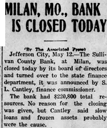 MILAN, MO., BANK IS CLOSED TODAY 'Br The Associated Press) Jefferson City, May The Sullivan County Bank, at Milan, was closed today by its board of directors and turned over to the state finance department, it was announced by S. L. Cantley, finance commissioner. The bank had $220,800 total resources. No reason for the closing was given, but Cantley said slow loans and frozen assets probably were the cause.