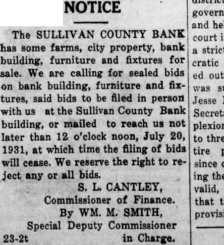 NOTICE The SULLIVAN COUNTY BANK has some farms, city property, bank building, furniture and fixtures for sale. We calling for sealed bids on bank building, furniture and fixtures, said bids to be filed in person with us the Sullivan County Bank building, or mailed to reach us not later than 12 o'clock noon, July 20, 1931, at which time the filing of bids will cease. reserve the right to any bids. CANTLEY, Commissioner of Finance. that By WM. M. SMITH, provision Special Deputy Commissioner in Charge.