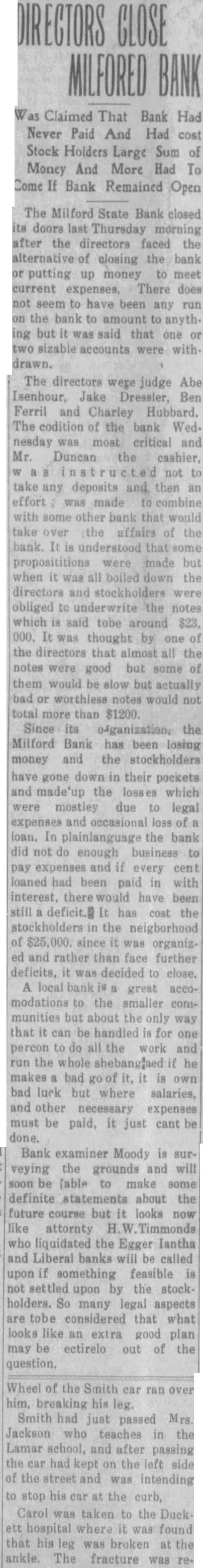 DIRECTORS CLOSE MILFORED BANK Was Claimed That Bank Had Never Paid And Had cost Stock Holders Large Sum of Money And More Had To Come If Bank Remained Open The Milford State Bank closed its doors last Thursday morning after the directors faced the alternative of closing the bank or putting up money to meet current expenses. There does not seem to have been any run on the bank to amount to anything but it was said that one or two sizable accounts were with. drawn. The directors were judge Abe Isenhour, Jake Dressler, Ben Ferril and Charley Hubbard. The codition of the bank Wednesday was most critical and Mr. Duncan the cashier, a not to take any deposits and then an effort was made to combine with some other bank that would take over the affairs of the bank. It is understood that some proposititions were made but when it was all boiled down the directors and stockholders were obliged to underwrite the notes which is said tobe around $23, 000. It was thought by one of the directors that almost all the notes were good but some of them would be slow but actually bad or worthless notes would not total more than $1200. Since its o-ganization, the Milford Bank has been losing money and the stockholders have gone down in their pockets and made'up the loss which were mostley due to legal expenses and occasional loss of a loan. In plainlanguage the bank did not do enough business to pay expenses and if every cent loaned had been paid in with interest, there would have been still a deficit. It has cost the stockholders in the neigborhood of $25,000. since it was organized and rather than face further deficits, it was decided to close. A local bank is a great accomodations to the smaller communities but about the only way that it can be handled is for one percon to do all the work and run the whole shebang,aed if he makes a bad of it, it is own bad luck but where salaries, and other necessary expenses must be paid, it just cant be done. Bank examiner Moody is surveying the grounds and will soon be lable to make some definite statements about the future course but it looks now like attornty Timmonds who liquidated the Egger Iantha and Liberal banks will be called upon if something feasible is not settled upon by the stockholders. So many legal aspects are tobe considered that what looks like an extra good plan may be ectirelo out of the Wheel of the Smith car ran over him, breaking his leg. Smith had just passed Mrs. Jackson who teaches in the Lamar school, and after passing the car had kept on the left side of the street and was intending to stop his car at the curb, Carol was taken to the Duckett hospital where it was found that his leg was broken at the ankle. The fracture was re-