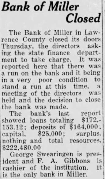 Bank of Miller Closed The Bank of Miller in Lawrence County closed its doors Thursday, the directors asking the state finance department to take charge. It was reported here that there was run on the bank and it being in a very poor condition to stand a run at this time, meeting of the directors was held and the decision to close the bank was made. The bank's last report showed loans totaling $172.153.12; deposits of $164,000: capital, $25,000; surplus, nothing and total resources. George Swearingen is president and F. A. Gibbons is cashier of the institution. It is the only bank in Miller.
