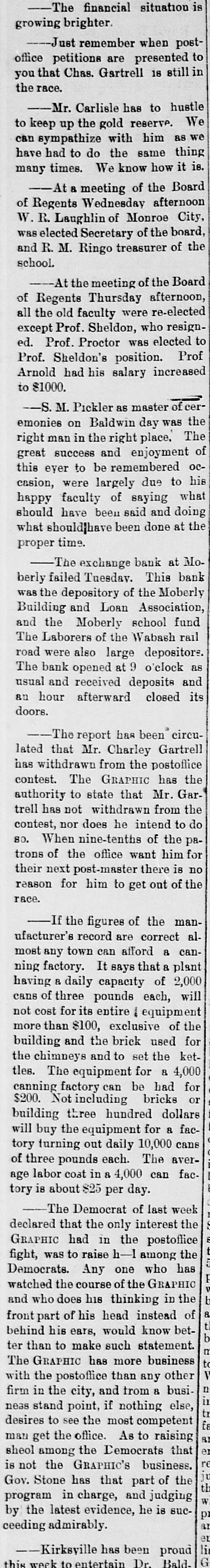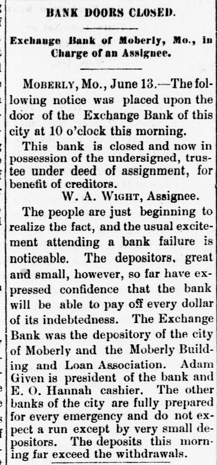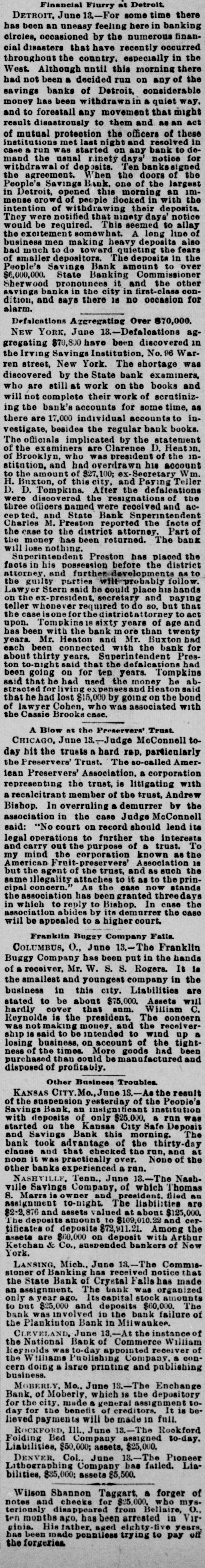 Financial Flurry at Detroit DETROIT, June -For some time there has been an uneasy feeling here in banking circles, occasioned by the numerous financial disasters that have recently occurred throughout the country. especially in the West. Although until this morning there had not been a decided run on any of the savings banks of Detroit. considerable money has been withdrawn in a quiet way, and to forestall any movement that might result disastrously to them and as an act of mutual protection the officers of these institutions met last night and resolved in case a run was started on any bank to demand the usual rinety days' notice for withdrawal of osits. Ten bankssigned the agreement. When the doors of the People's Savings Bank. one of the largest in Detroit, opened this morning an immense orowd of people flocked in with the intention of withdrawing their deposits. They were notified that ninety days' notice would be required This seemed to allay the excitement somew what. A long line of business men making heavy deposits also bad much to do toward quieting the fears of smaller depositors. The deposits in the People's Savings Bank amount to over $6,000,000. State Banking Commissioner Sherwood pronounces it and the other savings banks in the city in first-class condition, and says there 16 no occasion for alarm. Defalcations Aggregating Over $70,000. NEW YORK. June 13.-Defaleations aggregating $70,800 have been discovered in the Irving Savings Institution. No. 96 Warren street, New York. The shortage was discovered by the State bank examiners, who are still at work on the books and will not complete their work of scrutinizing the bank's accounts for some time, as there are 17,000 individual accounts to investigate, besides the regular bank books. The officials implicated by the statement of the examiners are Clarence D. Heat on of Brooklyn, who was president of the institution, and had overdrawn his account to the amount of $27,100; ex Secretary Wm. H. Buxton, of this city, and Paying Teller D. D. Tompkins. After the defalcations were discovered the resignations of the three officers named were received and accepted, and State Bank Superintendent Charles M. Preston reported the facts of the CR80 to the district attorney Part of the money has been returned. The bank will lose nothing. Superintendent Preston has placed the facts in his possession before the district attorney, and furtherdevelopments as to the guilty parties will-probably follow. Lawyer Stern said be could place his hands on the ex- president, secretary and paying teller whenever required to do so, but that the caseisoneforthedistrictattorney to act upon. Tompkins sixty years of age and has been with the bank more than twenty years. Mr. Heaton and Mr. Buxton bad each been connected with the bank for about thirty years. Superintendent Preston to night said that the defalcations had been going on for ten years. Tompkins said that he had used the money he abstracted living and ton said that he had lost $15,000 by going on the bond of lawyer Cohen, who was associated with the Cassie Brooks case. A Blow at the Preservers' Trust CHICAGO, June 3.-Judge McConnell today hit the trusts a hard rap. particularly the Preservers' Trust. The so-called American Preservers' Association. a corporation representing the trust, is litigating with a recalcitrant member of the trust. Andrew Bishop. In overruling a demurrer by the association in the case Judge McConnell said: "No court on record should lend its legal operations to further the interests and carry out the purpose of a trust. To my mind the corporation known as the American Fruit preservers' Association 18 but the agent of the trust. and as such the same illegality attaches to it as to the principal concern." As the case now stands the association has been granted threedays in which to reply to Bishop. In case the association abides by its demurrer the case will be appealed to a higher court. Franklin Buggy Company Fails COLUMBUS, O., June -The Franklin Buggy Company has been put in the hands of a receiver. Mr. W. S. S. Rogers. It is the smallest and youngest company in the business in this city. Liabilities are stated to be about $75,000. Assets will hardly cover that anm. William C. Reynolds is the president. The concern was not maki money. and the receiver ship 18 said to be intended to wind up a losing business. on account of the tightness of the times. More goods had been purchased than could be manufactured and disposed of profitably. Other Business Troubles. KANSAS CITY Mo., June 18. As the result of the suspension yesterday of the People's Savings Bank an insignitican institution with deposits of only $25,000. a run was started on the Kansas City Safe Deposit and Savings Bank this morning. The bank took advantage of the thirty-day clause and that checked the run, and at noon it was practically over. None of the other banks experienced a run. NASHVILLE, Tenn., June 13.-The Nashville Savings Company, of which Thomas 8. Marra is owner and president. filed an assignment to-night. The liabilities are $2-2.876 and assets valued at about $125. 000. The deposits amount to $109,010.22 and certificates of deposite $72,911.21 Among the assets are $60,000 on deposit with Arthur Ketchan & Co., suspended bankers of New York. LANSING, Mich. June 13.-The Commisstoner of Banking has received notice that the State Bank of Crystal Falls has made an assignment. The bank was organized only a year ago. Its capital stock amounts to but $25,000 and deposits $60,000. The bank was involved 10 the bank failure of the Plankinton Bank in Milwaukee, CLEVELAND, June 13 -At the instance the National Bank of Commerce William ;nolds was to-day appointed receiver the Williams Publishing Company, concern doing a large printing and publishing business. MOBERLY. Mo., June 13.-The Enchange Bank, of Moberly, which is the depository for the city made a general assig emment day for the benefit of creditors. It is beli